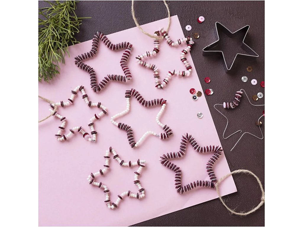 Jednoduše vytvarujte nit kolem vykrajovátka ve tvaru hvězdy a poté přidejte korálky a flitry. Pokud chcete, můžete je kombinovat a vytvářet tak jedinečné vzory pro hvězdy. Použijte hvězdy ve svých vánočních dekoracích, například na vánočním stromečku nebo v okně – nebo je použijte jako dekorativní doplněk na vánočních dárcích.