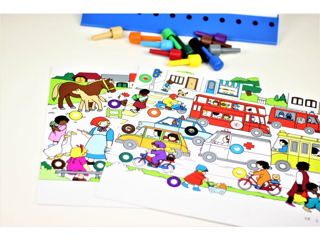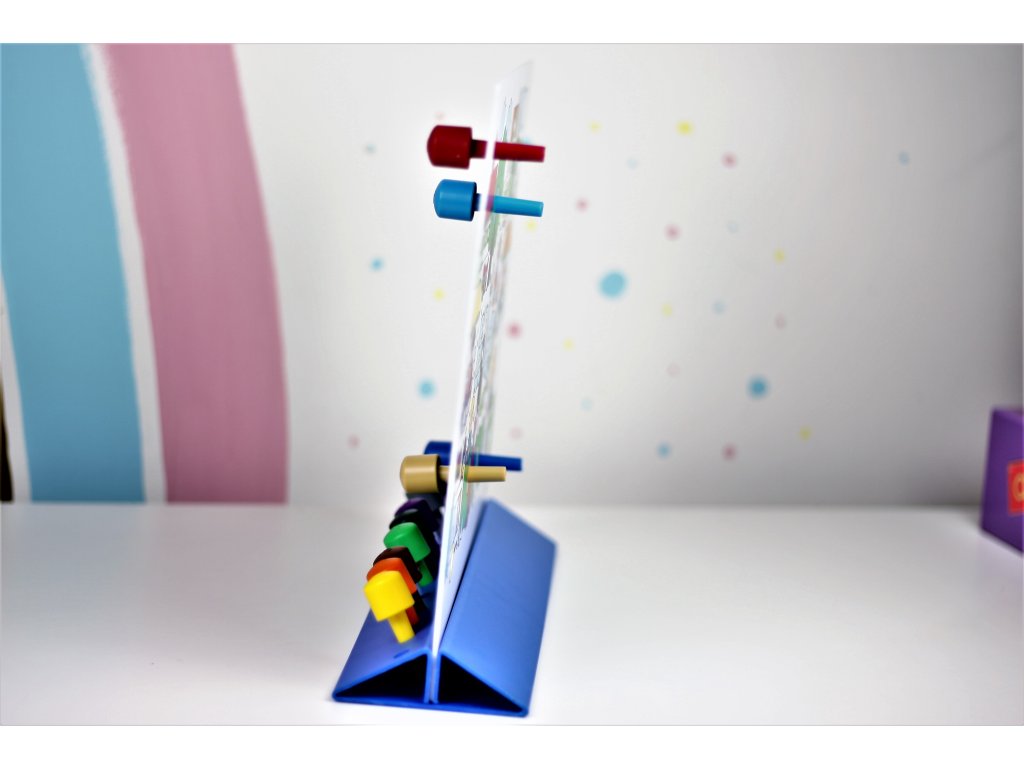 Jeden dává rady ke konkrétnímu obrázku a druhý musí zjistit, který obrázek odpovídá popisu a dle toho vloží barevný kolíček do otvoru na tabuli.