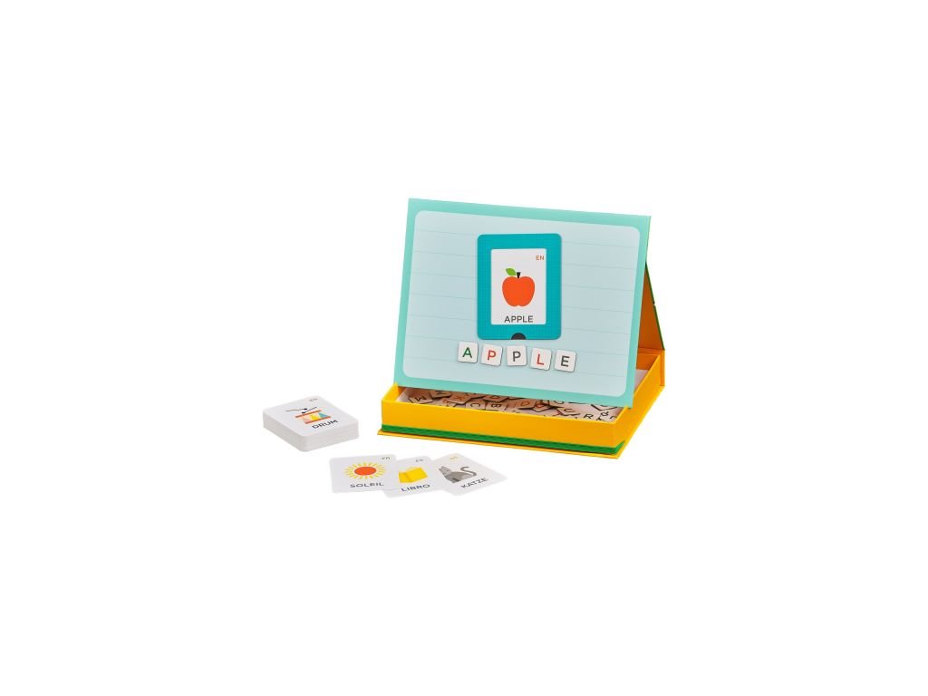Obsahuje 52 karet se slovíčky a 63 magnetických písmen. Slova ve 4 různých jazycích – angličtině, němčině, španělštině a francouzštině. Veselé ilustrace a barevná písmena, to je úplná škola hrou! Uloženo v praktickém boxu, který lze jednodušše uklidit třeba do knihovny.