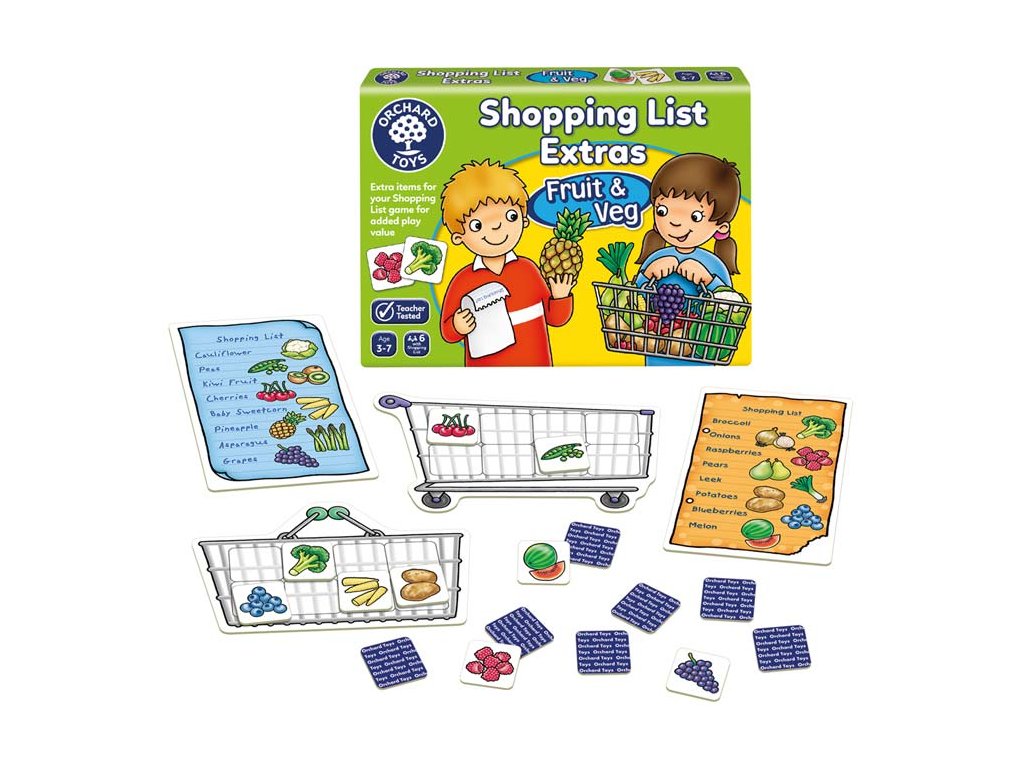 Doplněk ke hře Nákupní seznam, ve které zábavnou formou "nakupování" rozšiřujeme anglickou slovní zásobu. Tentokrát o slovíčka z oblasti OVOCE a ZELENINA. Hra pro 2 - 4 hráče ve věku od 3 let.