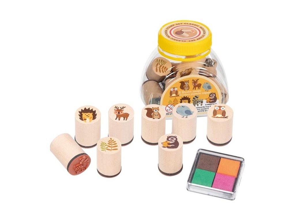 - 8 různých razítek (veverka, ptáček, sova, ježek, jelen, medvěd, mýval a listy)