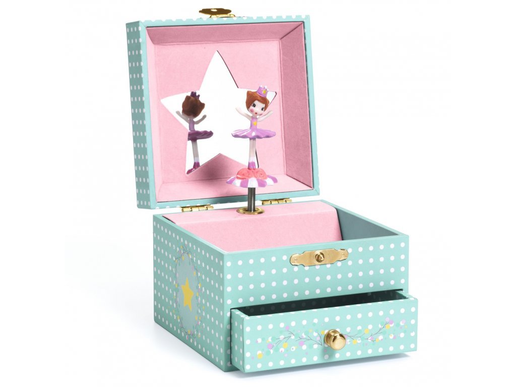 Krásně ilustrovaná hrací skříňka s roztomilou balerínou a zásuvkou na poklady a šperky pro malé parádnice.