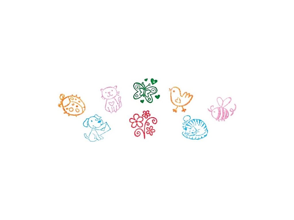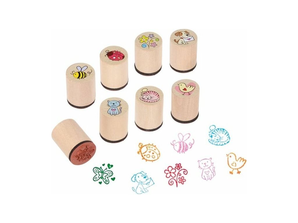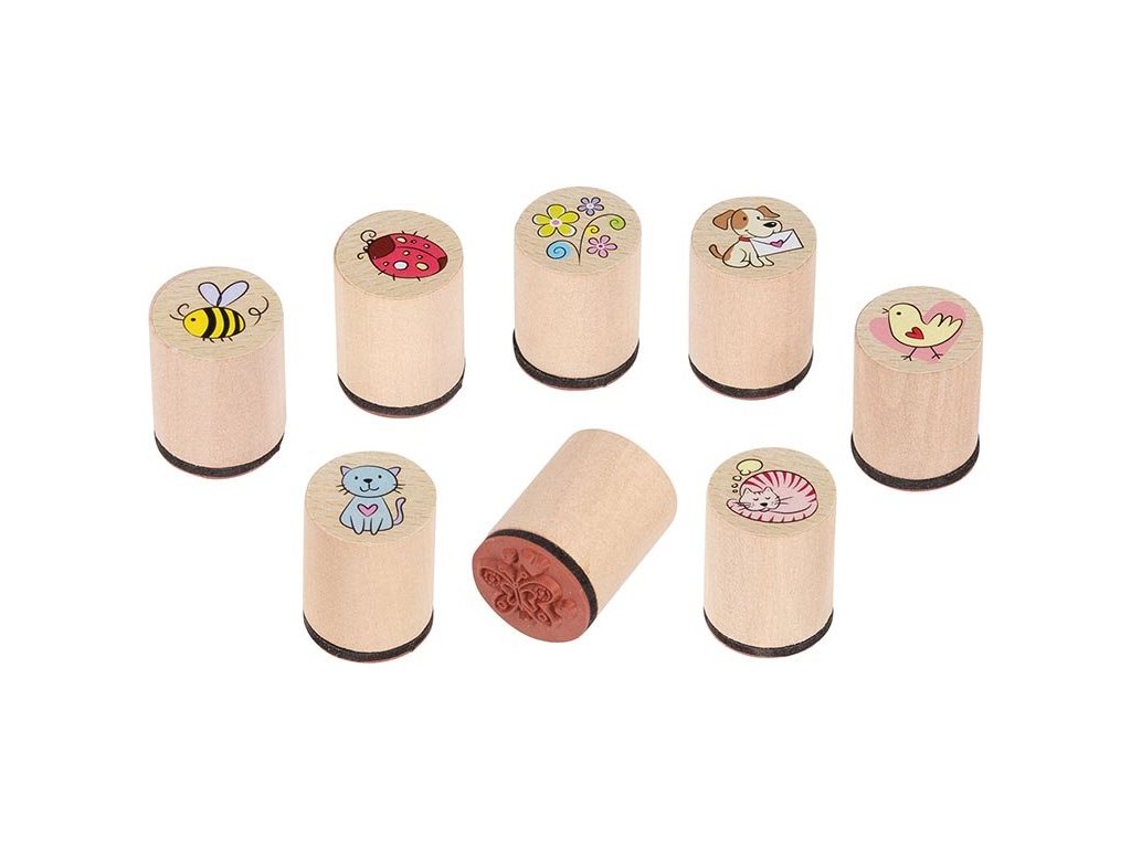 Dřevěná razítka s roztomilými motivy: beruška, včelka, květina, motýl, ptáček, kočka, pes a spící kočka. Vhodné jako drobný dárek nebo pro kreativní tvoření.