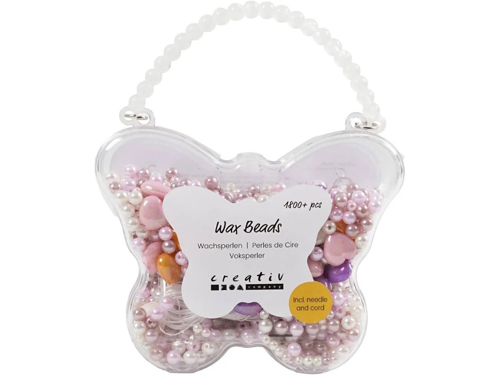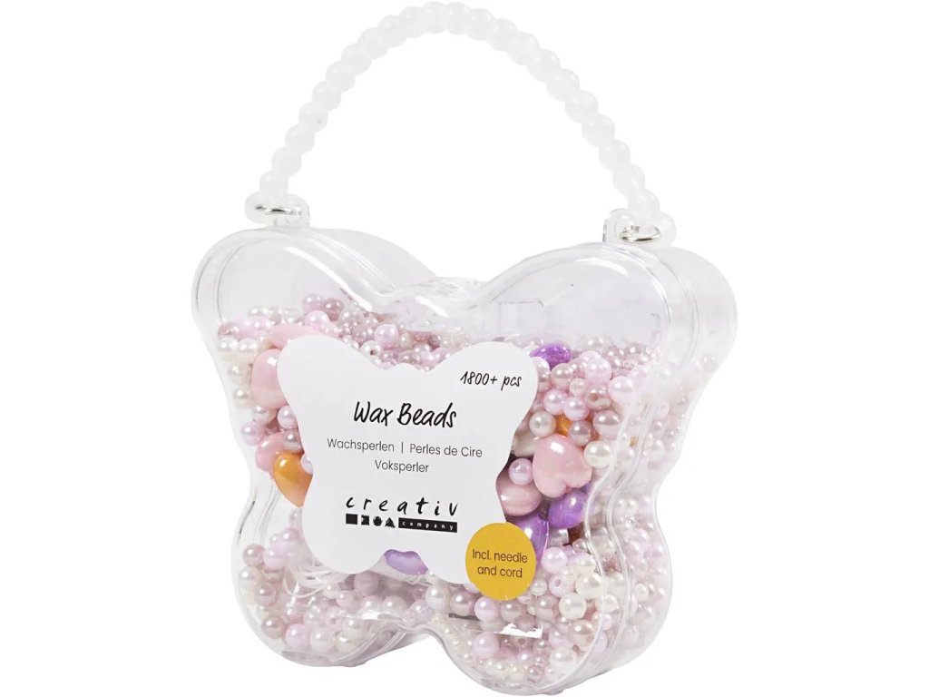 Sada obsahuje přes 1800 různě velkých voskovaných perel a srdíček v pastelových barvách, elastickou šňůrku a perlovou jehlu.
