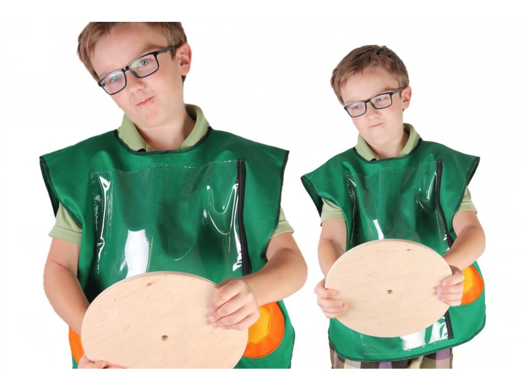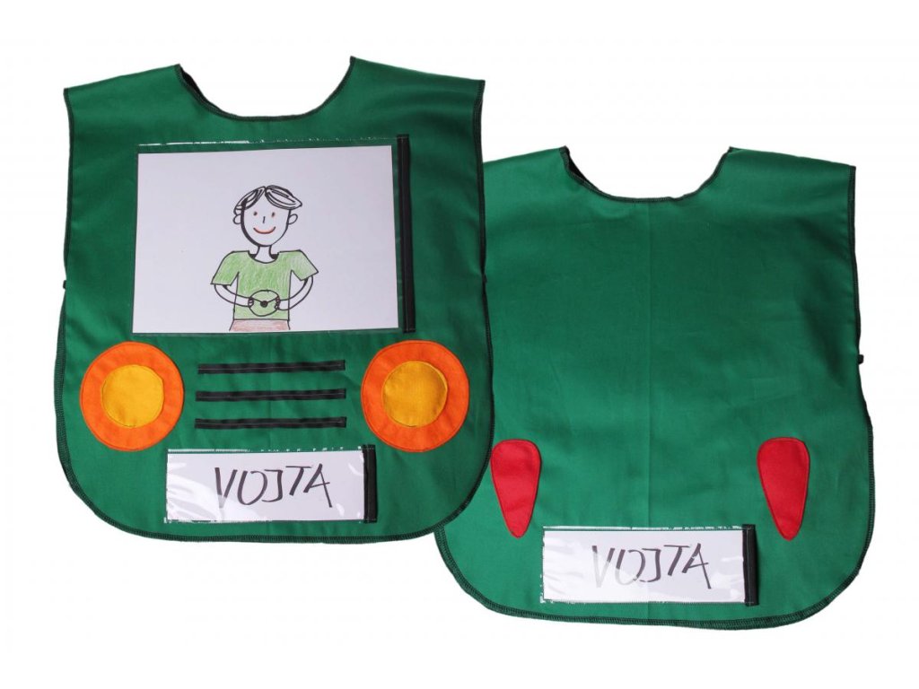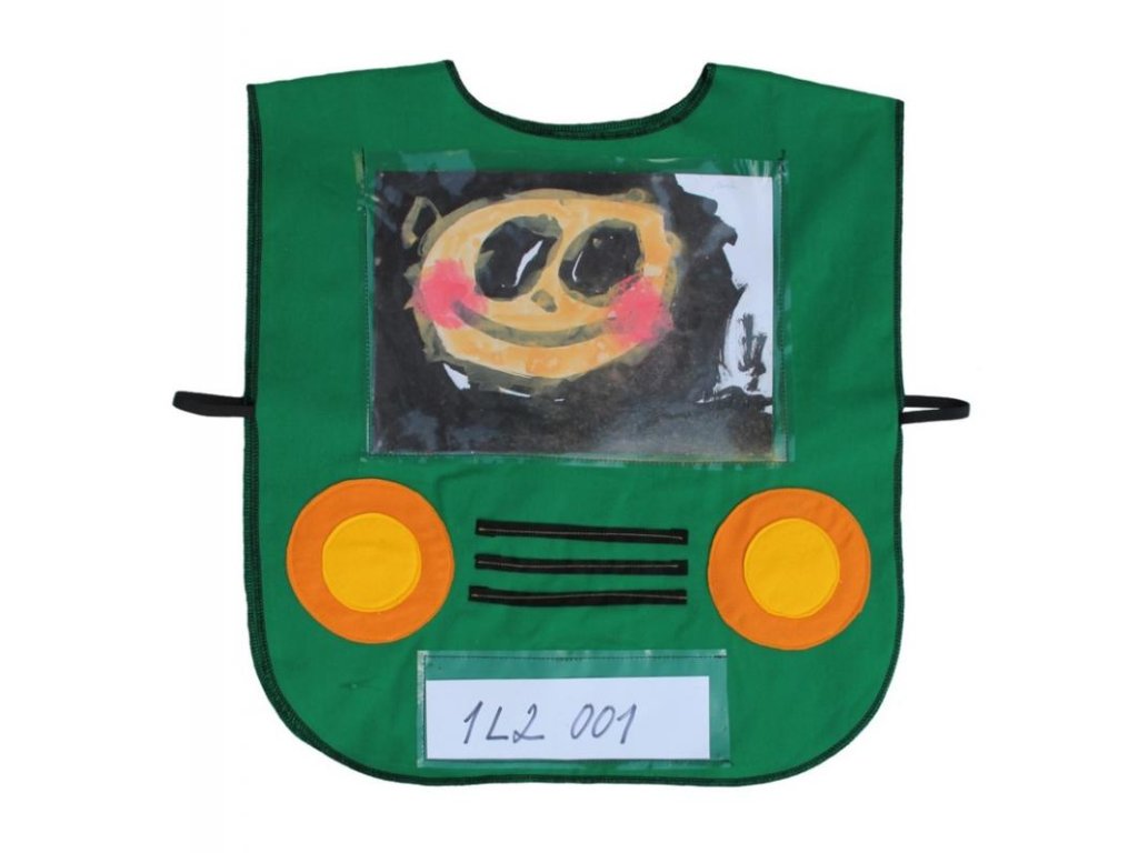 Zelená vestička napodobující auto má na přední straně dvě průhledné kapsy, do kterých si děti mohou namalovat podobiznu řidiče, SPZ automobilu, svoje jméno nebo řidičský průkaz. Kapsa na SPZ nebo jméno nechybí ani na zadní straně auta.