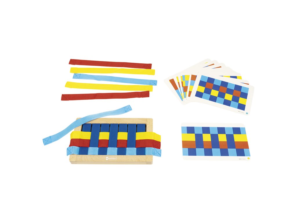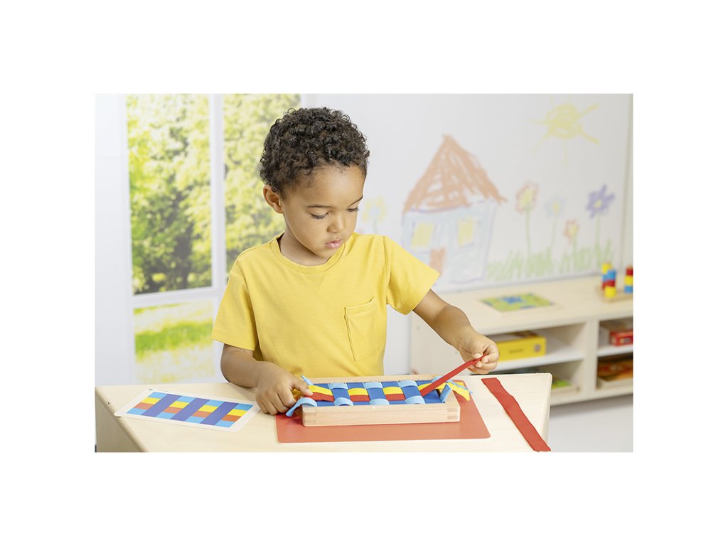 Děti si mohou vyzkoušet základní principy tkaní tím, že barevné textilní pásky protkávají ve speciálním dřevěném rámu s gumičkami, čímž vytvářejí různé vzory a obrazce. Sada je skvělá pro individuální hru nebo společnou práci v malých skupinách.