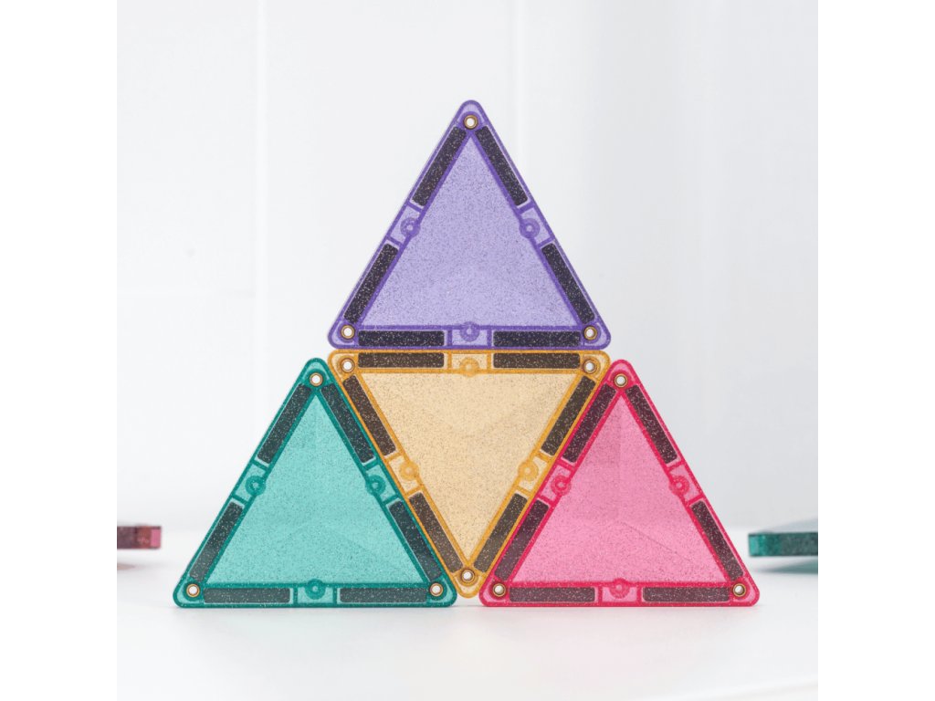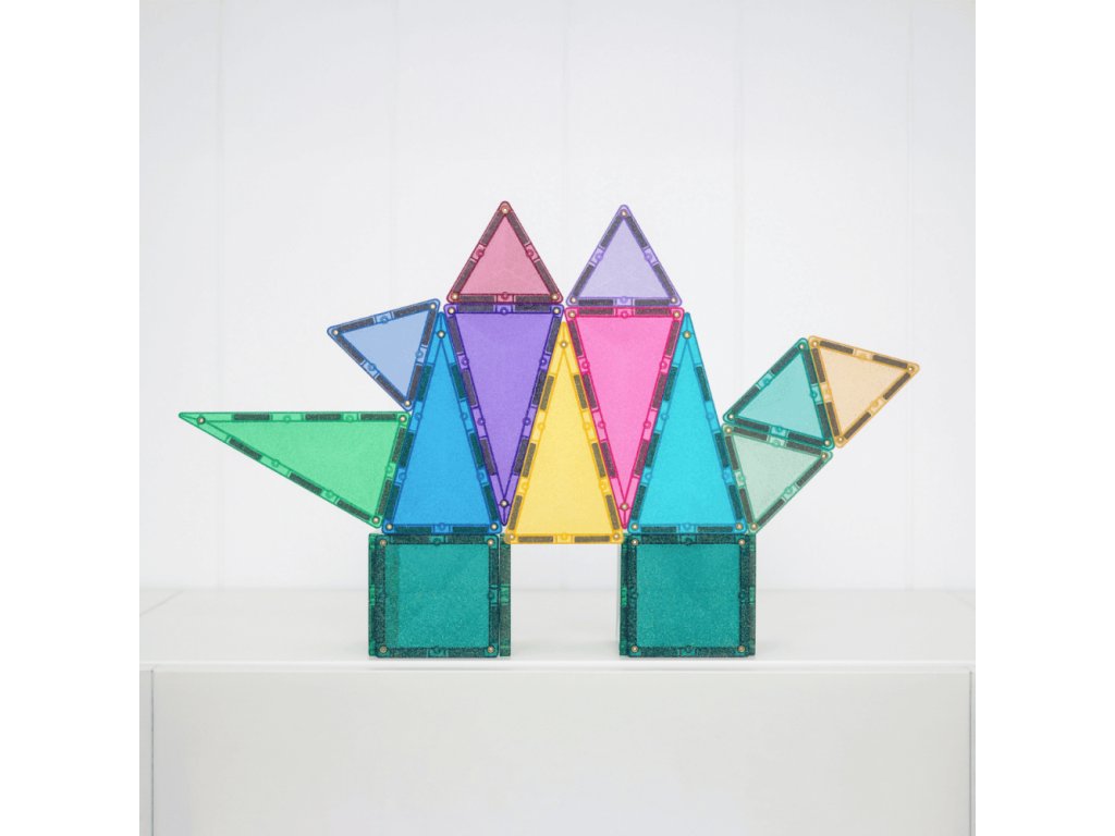 Sada Třpytivého zámku je stvořená pro magické stavby. Děti mohou začít jednoduše – postavit základní čtvercovou věž a postupně ji rozšířit o trojúhelníkové střechy. Kombinací více dílků vznikají majestátní hrady se špičatými věžemi, mosty i barevnými vitrážemi, které se třpytí při každém pohybu světla.