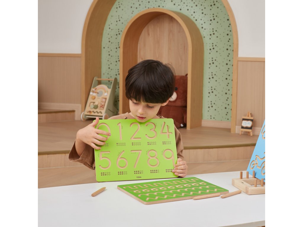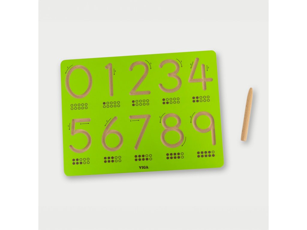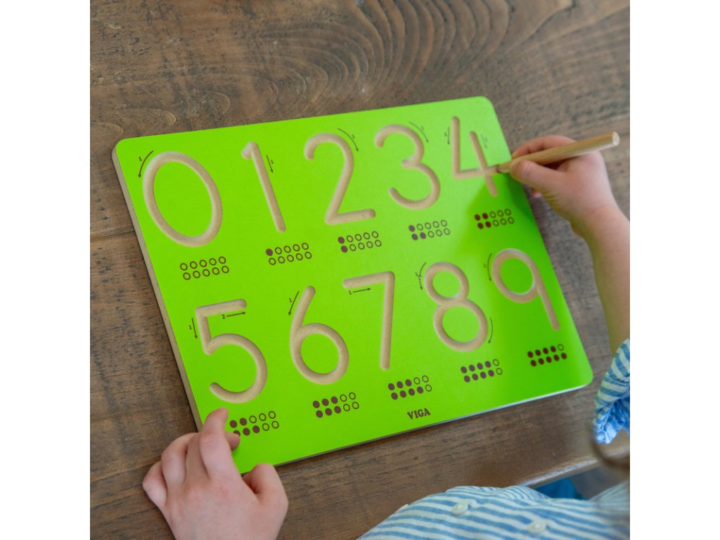 Skvělá pomůcka pro nácvik správného vedení ruky a tvarů číslic. Každá číslice je jemně vyrytá s nápovědou pro správný směr, takže děti mohou prstem nebo tužkou sledovat drážky a budovat paměť pohybů potřebných pro psaní.