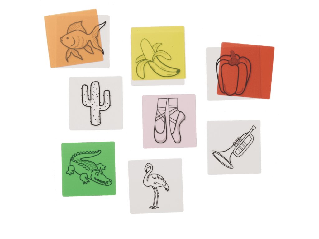 Hravá sada kombinující obrázky předmětů s průhlednými barevnými kartami - děti přiřazují barevnou fólii ke správnému obrázku (např. červené jablko či zelený list), čímž procvičují slovní zásobu, komunikaci a barvy.