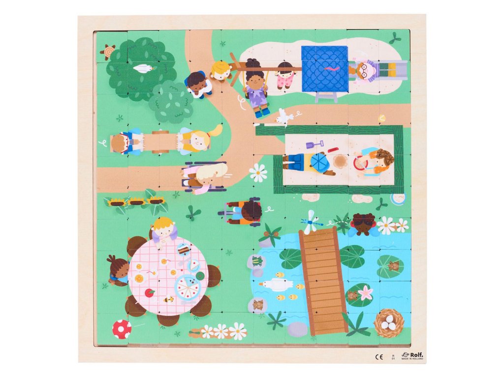 Objevte dřevěnou didaktickou skládačku značky Rolf Education - inovativní oboustrannou skládačku, která podporuje rozvoj dětské kreativity a fantazie! Z jedné strany skládejte obrázek, který je dětem blízký a jeho téma je zahrada nebo hřiště mateřské školy. Druhá strana každého dílku má svou barvičku. Využít můžete k třídění podle barev nebo ke skládání mozaiek různých tvarů.
