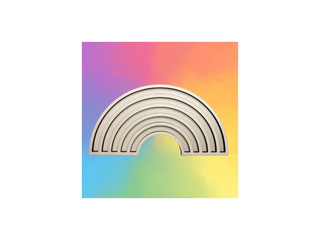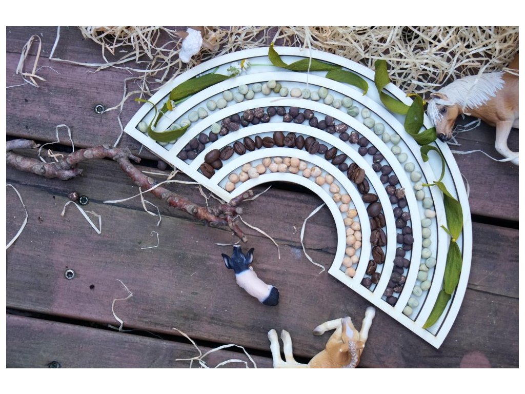 Dřevěný tácek s motivem duhy. Děti mohou tácky "vybarvit" barevným smyslovým materiálem (barevná rýže, cizrna, kinetický písek,..). Oblíbené jsou tácy také na třídění (například barev, různých druhů surovin a podobně). Skvělá pomůcka nejen pro senzorickou hru na doma i do školek.