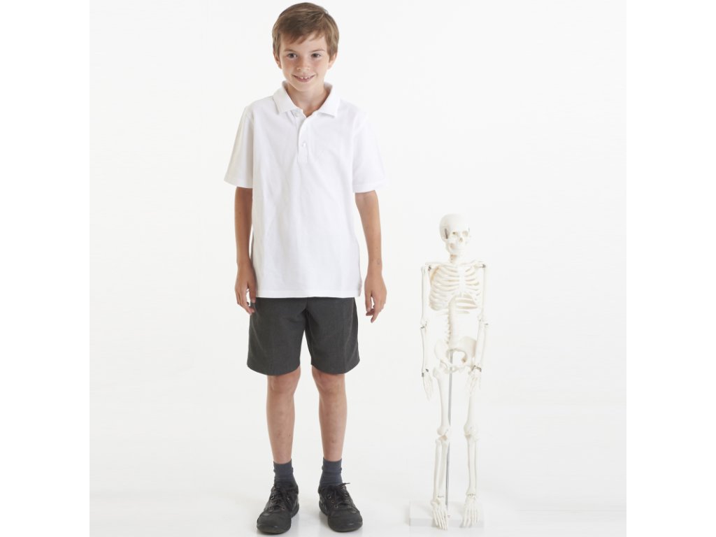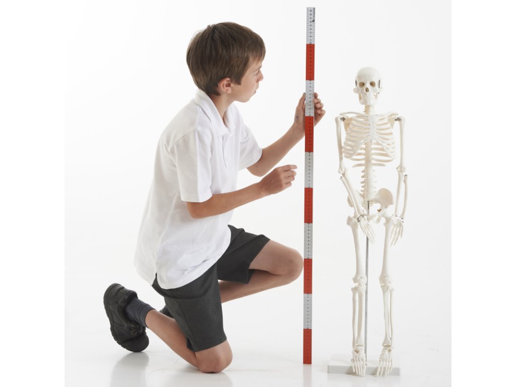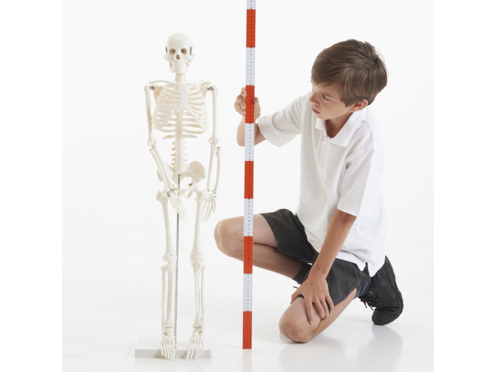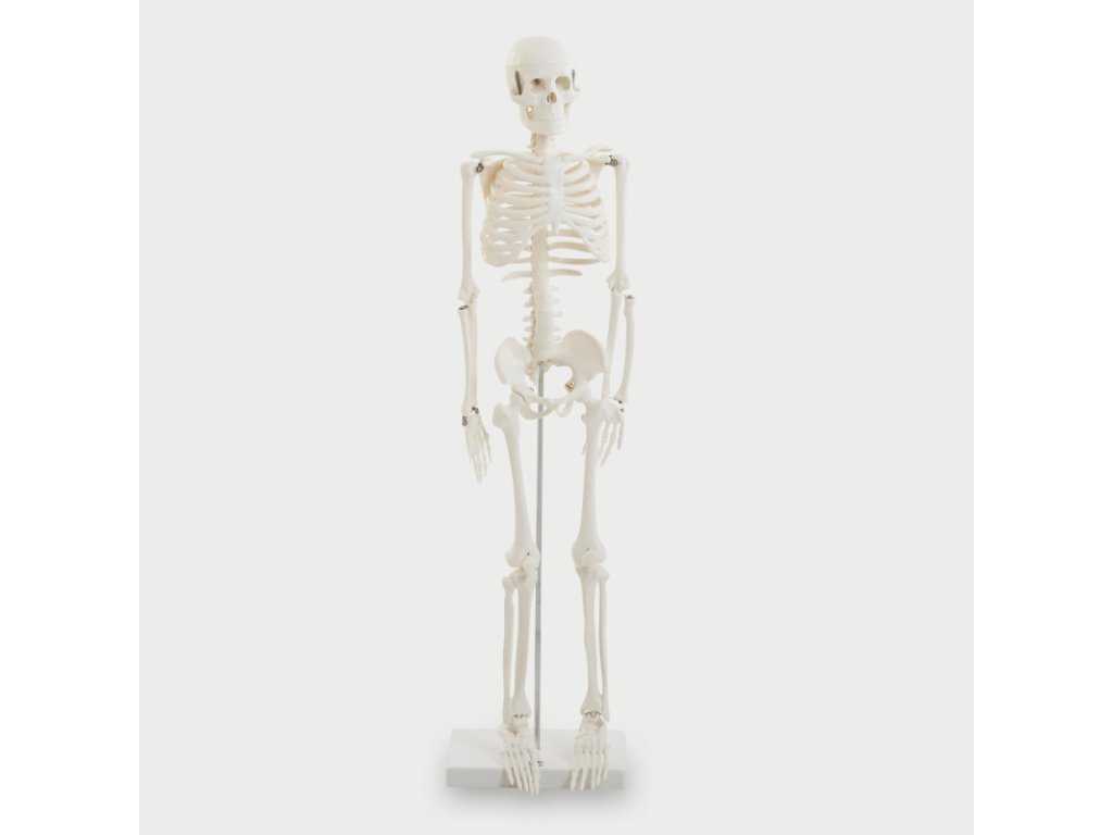 Model lidské kostry v poloviční velikosti. Pohybují se všechny hlavní klouby, včetně ramene, lokte, zápěstí, kyčle, kolena, čelisti a kotníku.