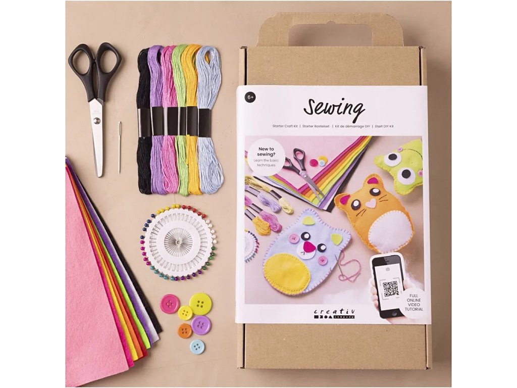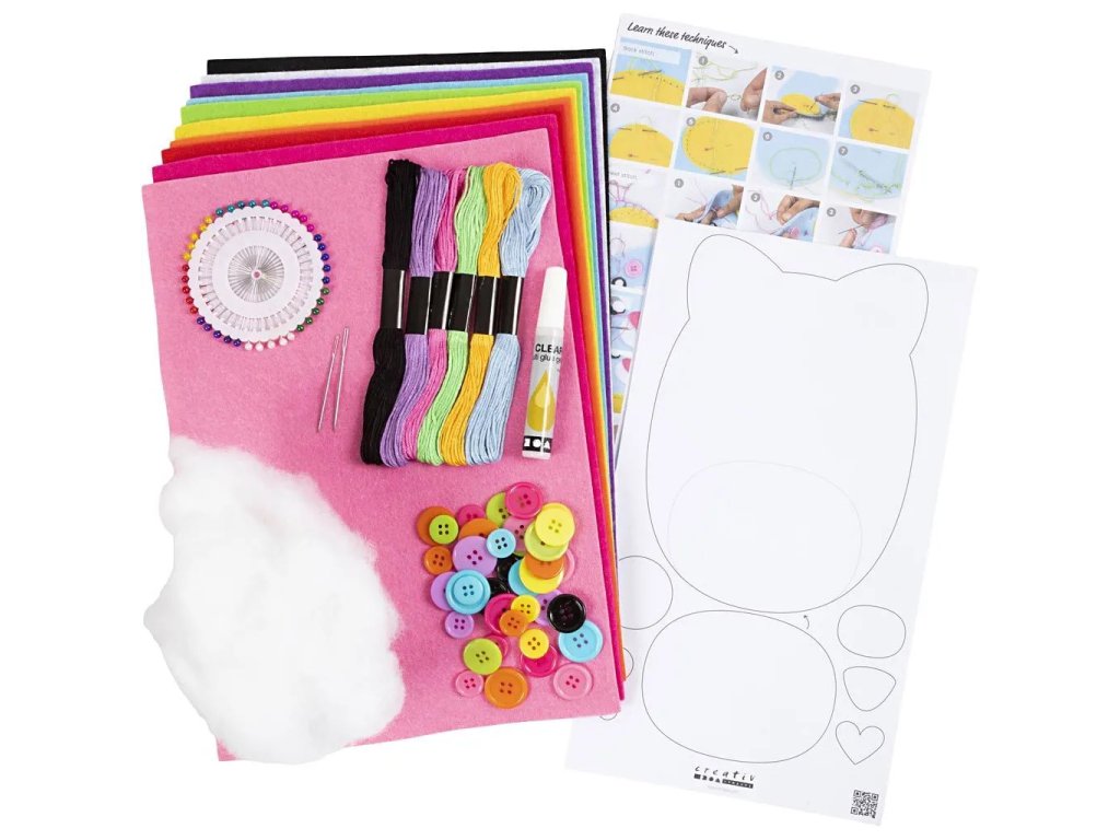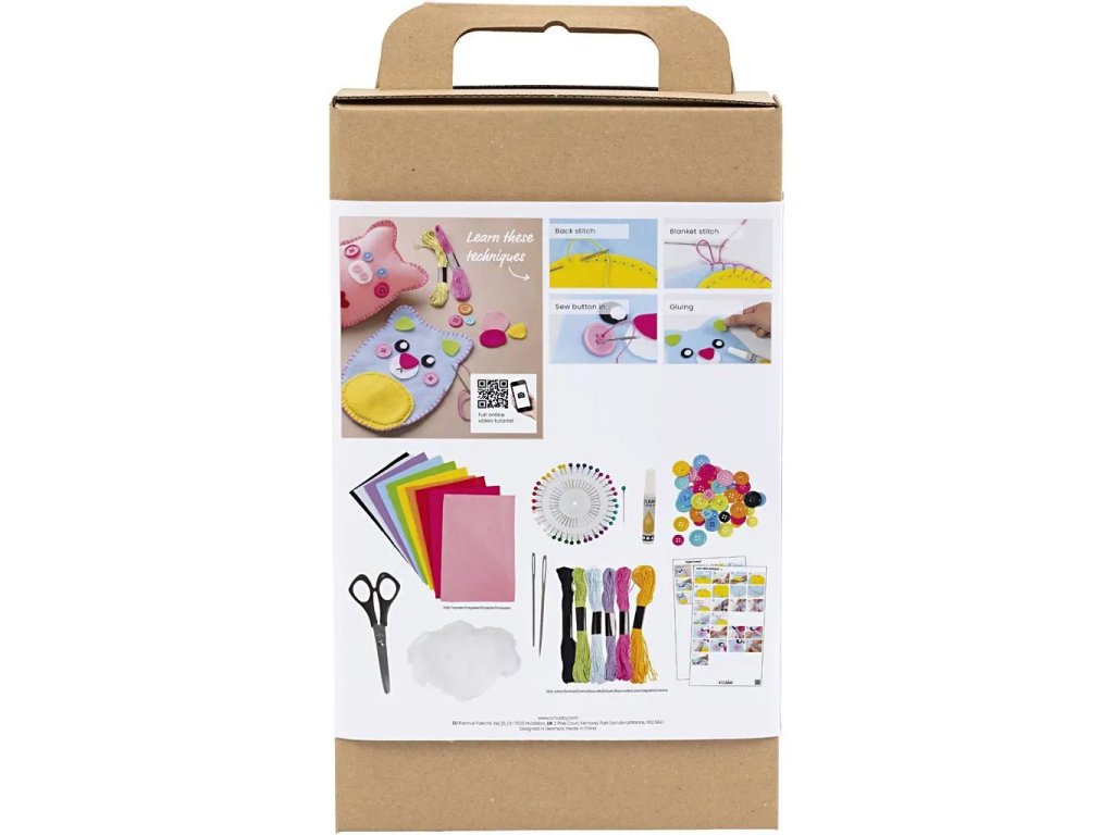Kreativní šicí sada na výrobu zvířátek je perfektní pro všechny, kteří chtějí začít se šitím. Sada obsahuje vše potřebné k vytvoření roztomilých plyšových medvídků - plsť, nitě, knoflíky, jehly, výplň, lepidlo a nůžky. Instrukce a QR kód vedou na stránky s videonávody, které vás provedou základy šití.