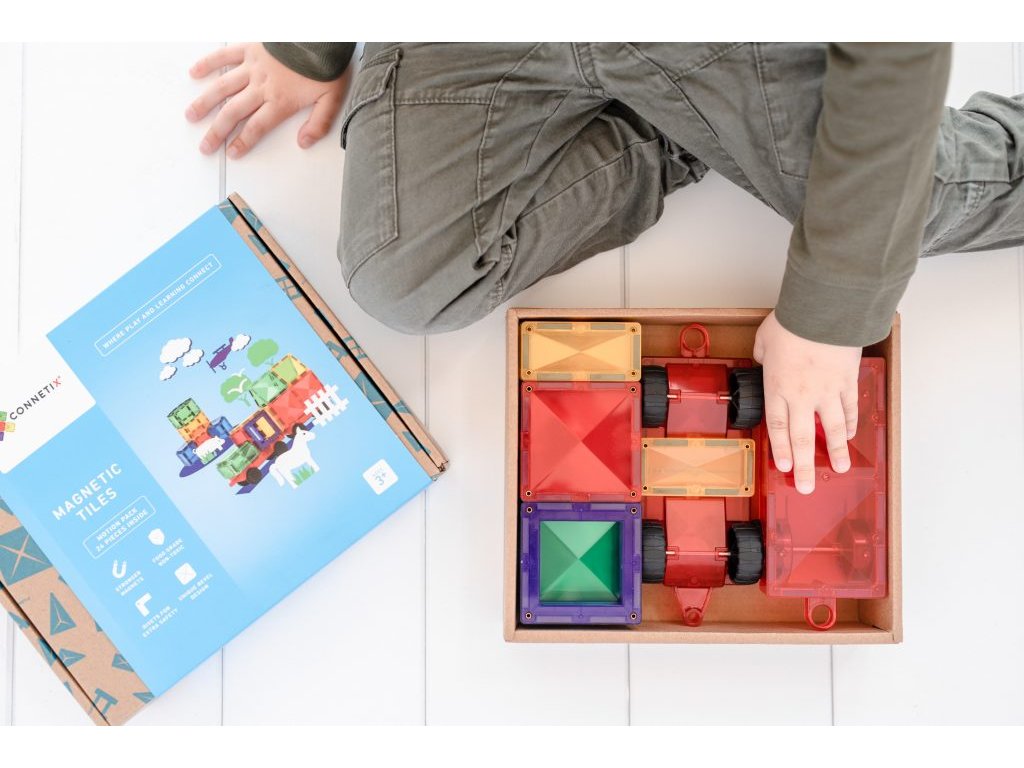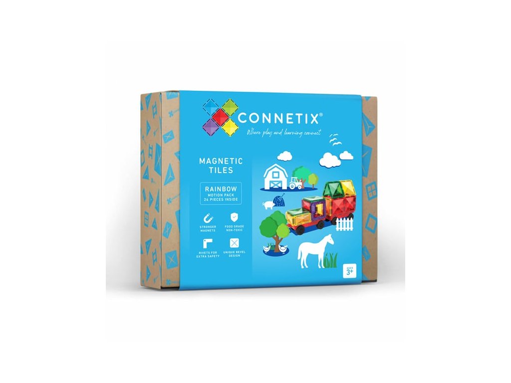 Magnetická stavebnice Connetix - 24 kusů, základ pro auta rozvíjí dětskou kreativitu a jemnou motoriku. Stavebnice je transparentní a její duhové barvy tak můžete zároveň pozorovat ve světle nebo třeba ve spojení s LED tabletem využít jako sensorickou pomůcku. Na stavebnici můžete pomocí světla a různých barev dílků pozorovat principy míchání barev a objevovat další nové odstíny.