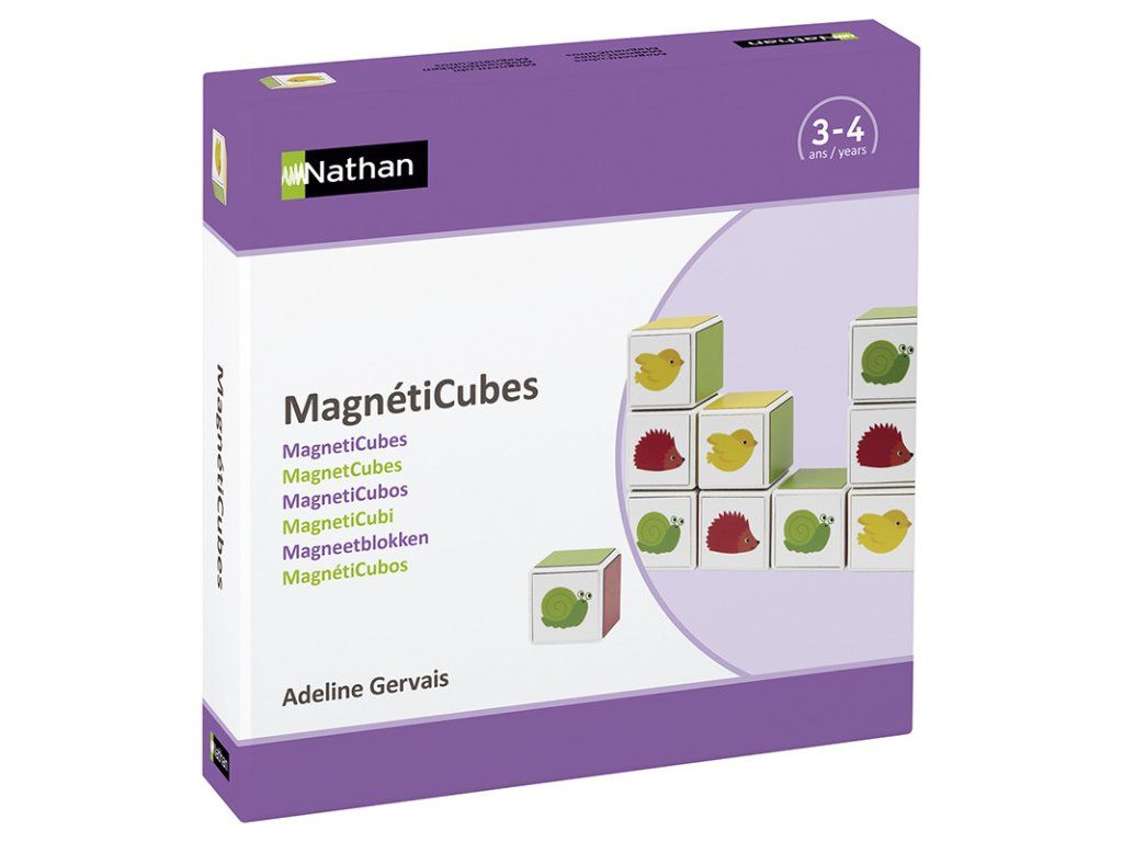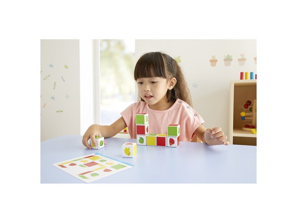 Hravá didaktická sada nabízí jednodušší skládání řad až po náročnější úkoly zaměřené na prostorovou orientaci a práci podle předloh. 9 magnetických kostek (3,5 cm) s barevnými i ilustrovanými stranami umožňuje vytvářet linie, věže, shluky i různé vzory.