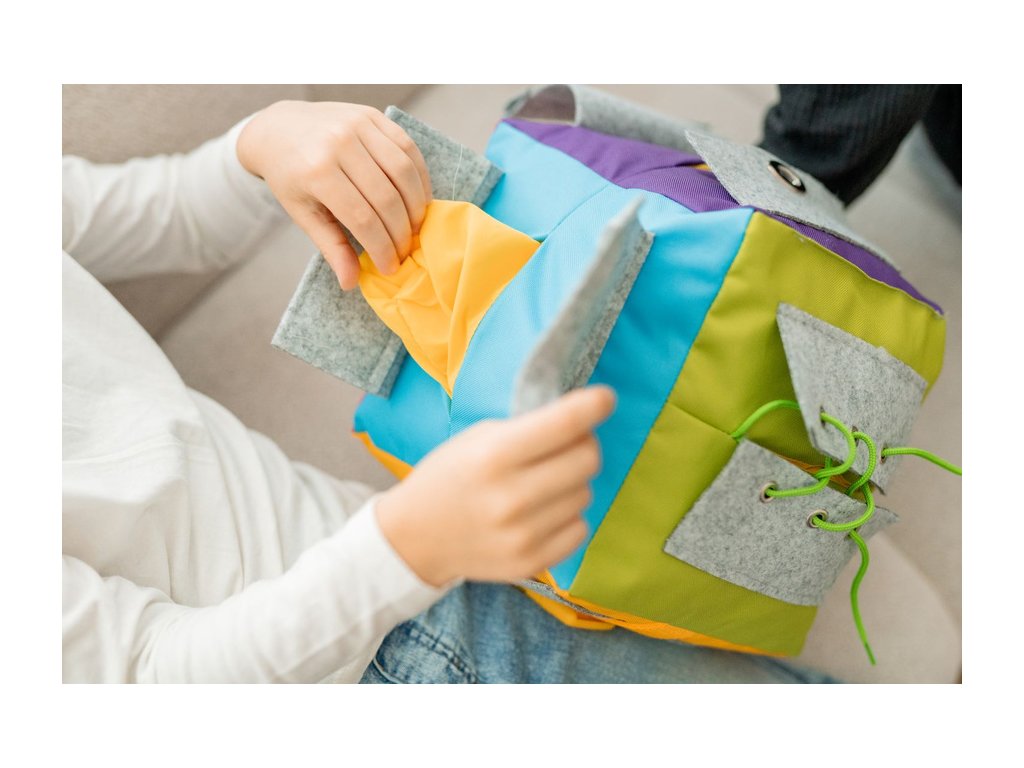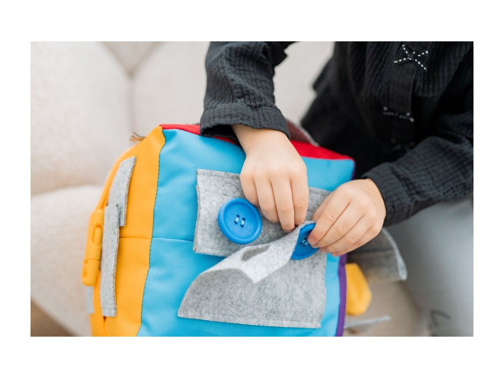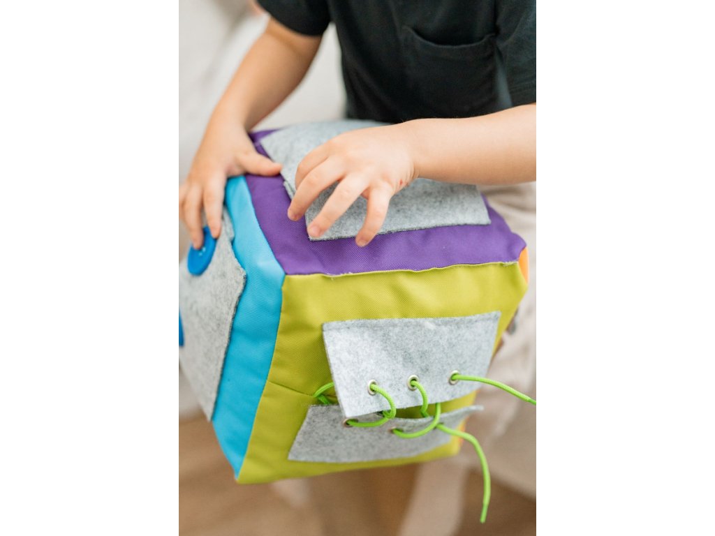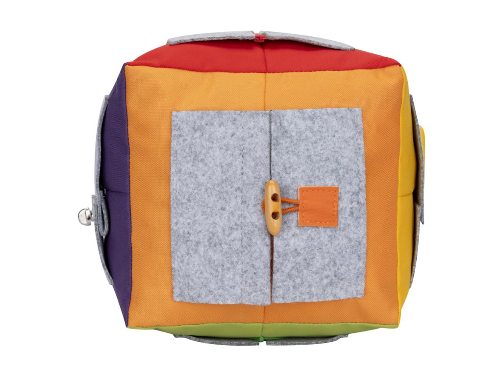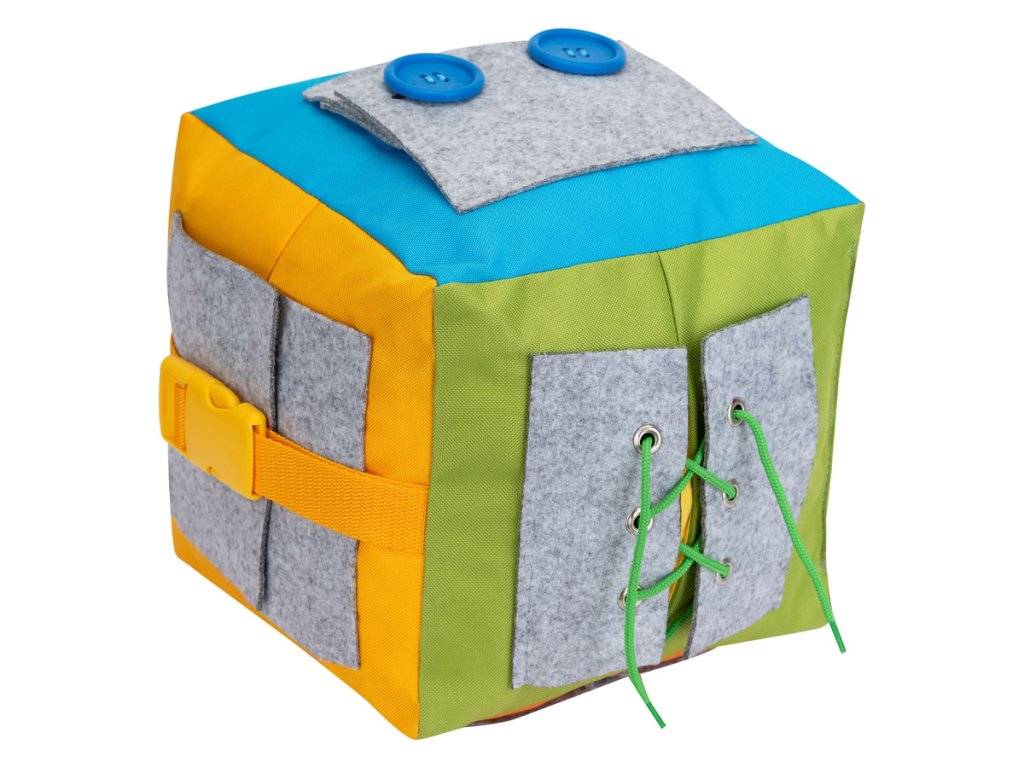 Motorická kostka s různými druhy zapínání a kapsami na překvapení