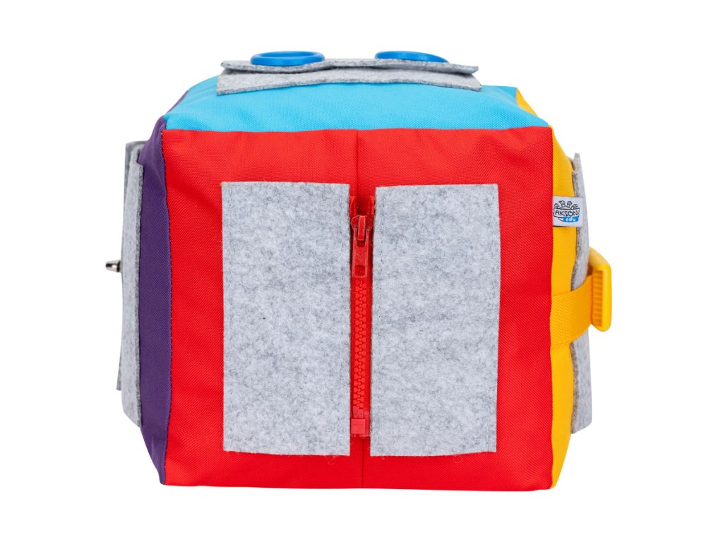 Motorická kostka s kapsami na překvapení a různými druhy zapínání je jedinečná edukační pomůcka navržená tak, aby přirozeně podporovala motorický a kognitivní vývoj dětí. Každá strana této barevné kostky skrývá nové dobrodružství – od zipů přes šněrování až po knoflíky a spony! Každá strana má navíc kapsičku na malé překvapení (můžete do ní ukrýt drobnosti jako figurku, obrázek nebo malý předmět).
