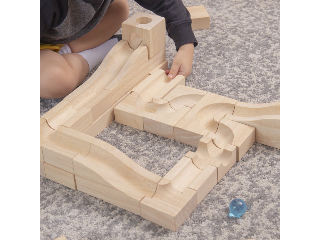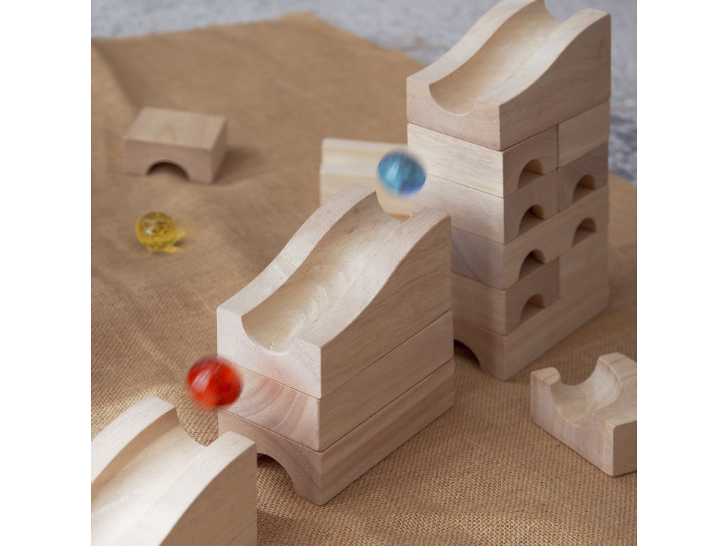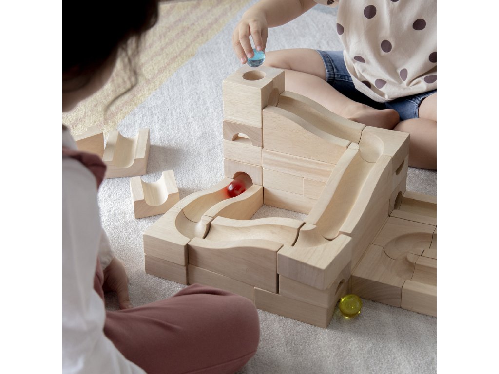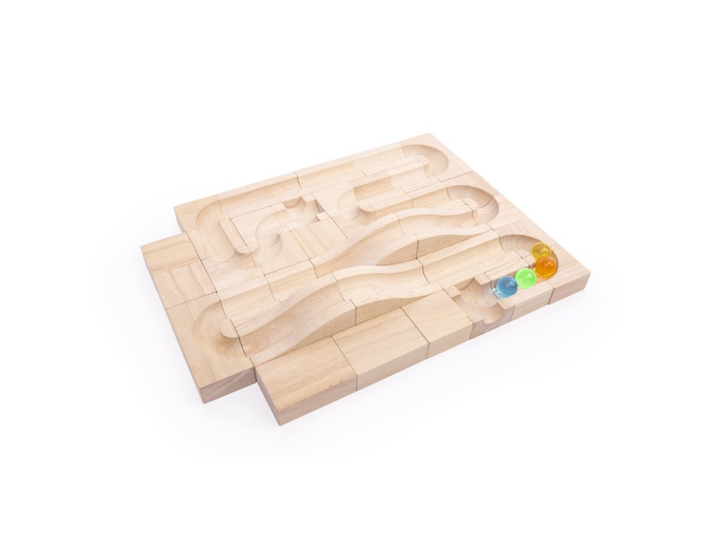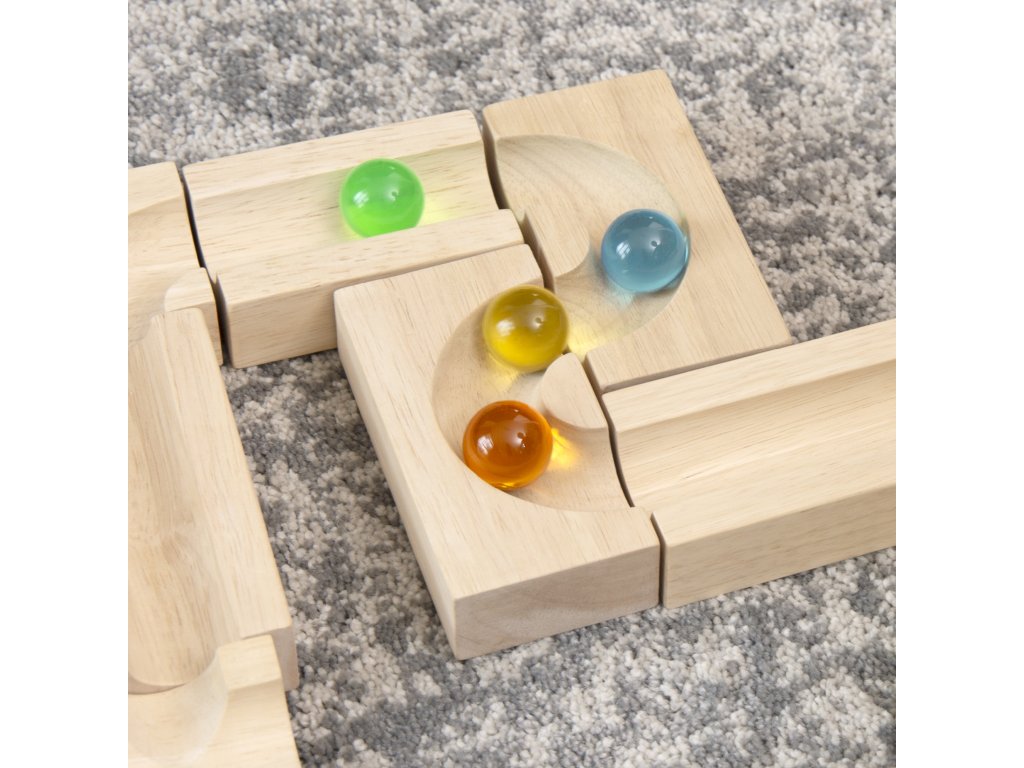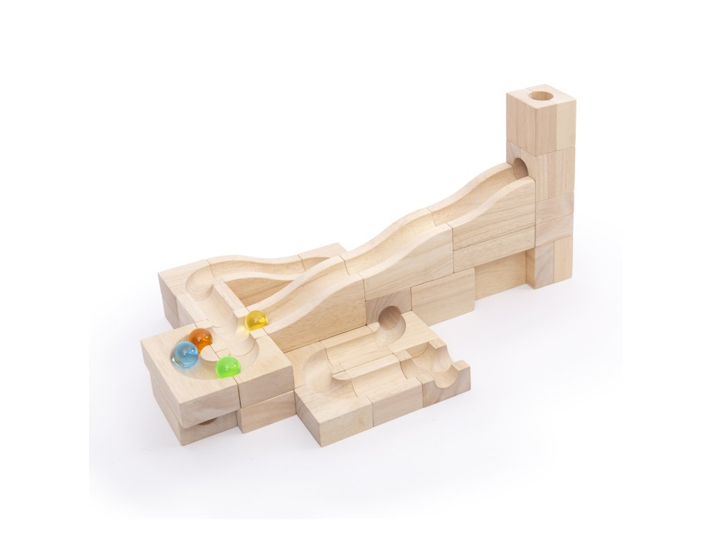 Velké bloky z kaučukového dřeva i větší akrylové kuličky jsou ideální pro menší ruce dětí od 3 let. U této dráhy strávíte společně s dětmi spoustu času, protože můžete stavět nekonečně mnoha různými způsoby!