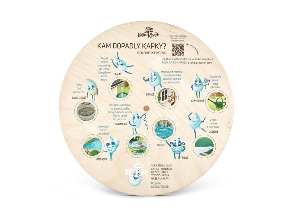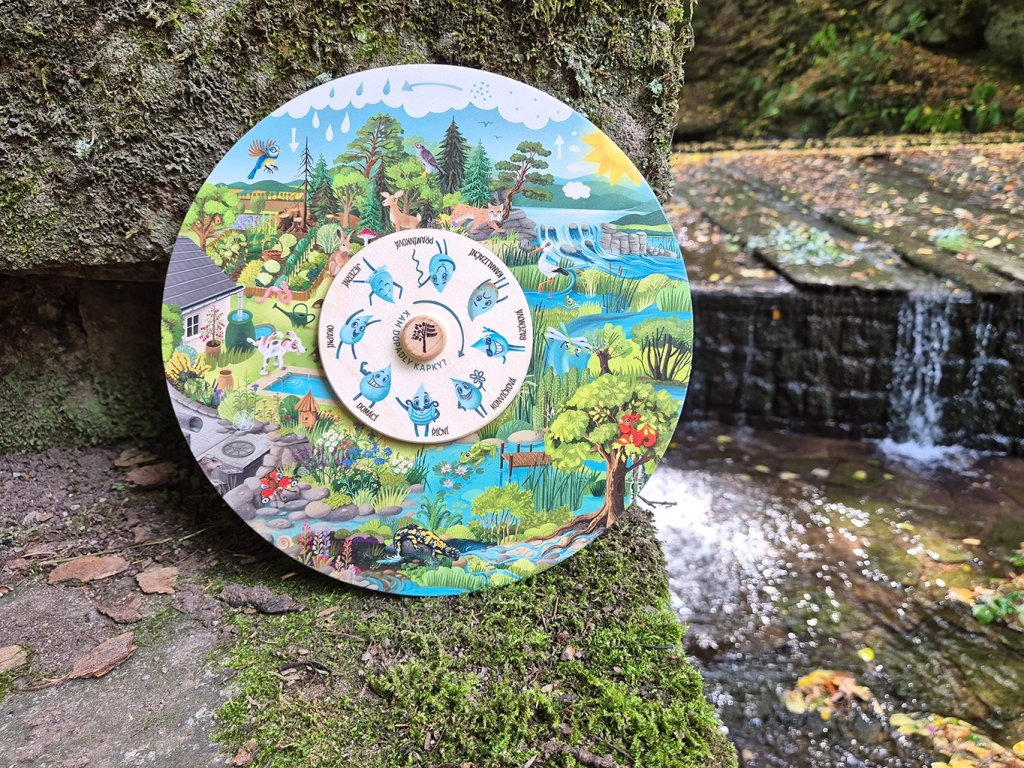 Děti otáčením kola zjišťují, kam která kapka dopadla, a přitom poznávají, že voda neustále mění svou podobu – z kapky v páru, z páry v déšť, z deště do řeky nebo do okapu.
