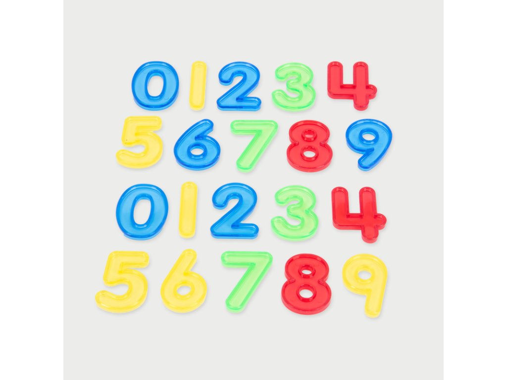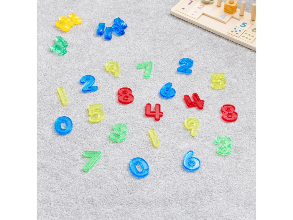 Sada obsahuje 20 průsvitných číslic (výška 5 cm) ve 4 barvách (každá číslice 2x).