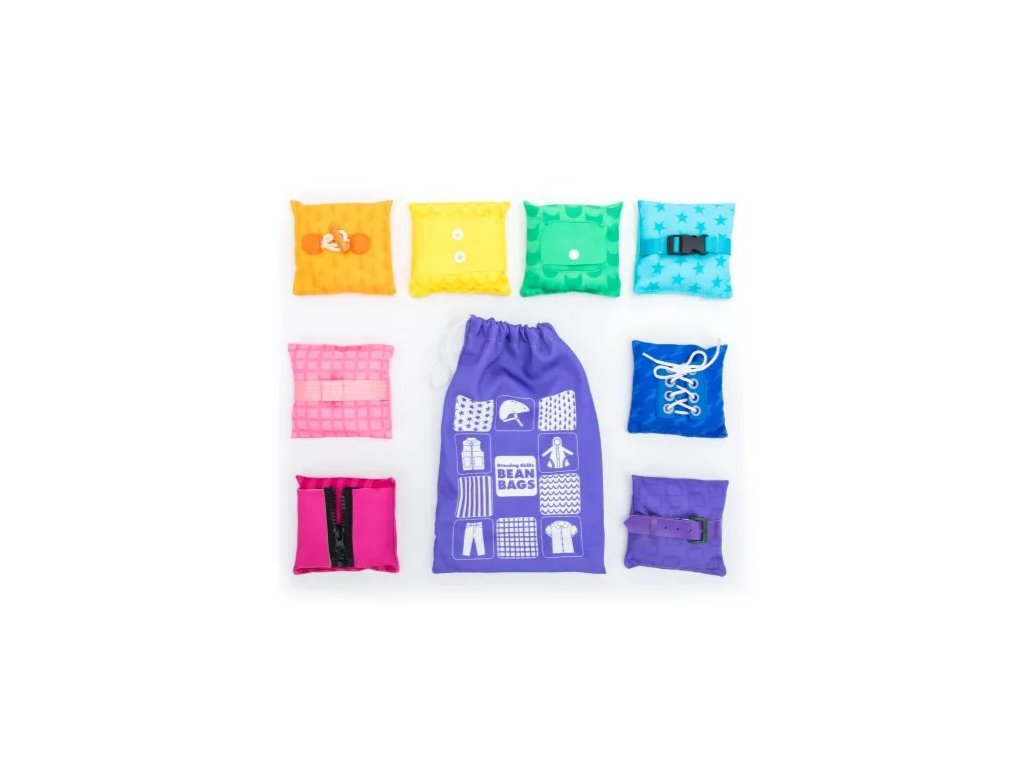 Oboustranné pytlíčky na rozvoj oblékacích dovedností přinášejí hravý a názorný způsob, jak si děti osvojí zapínání i zavazování díky různým typům zapínání. Každý pytlíček ukrývá na jedné straně skutečný typ zapínání (zip, tkaničky, knoflík, přezka, patent, háček a očko aj.) a na druhé straně obrázek odpovídajícího kusu oblečení.