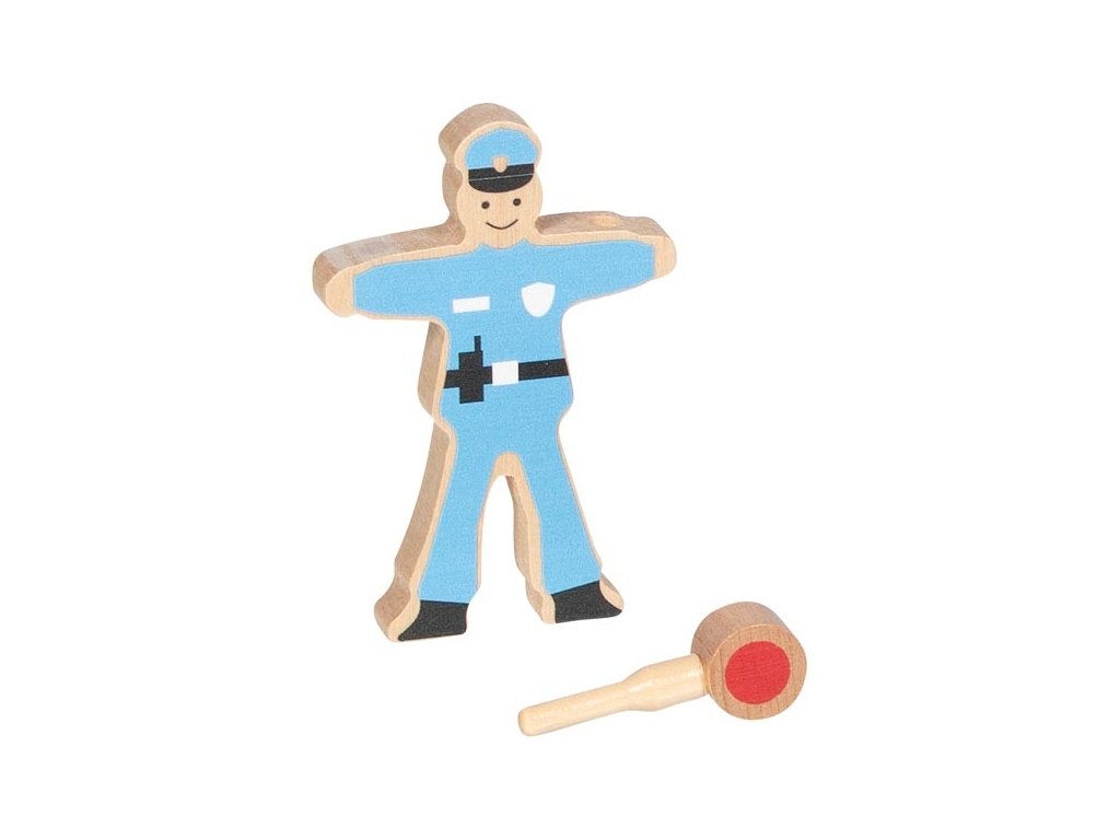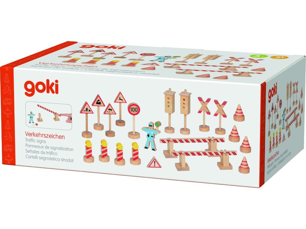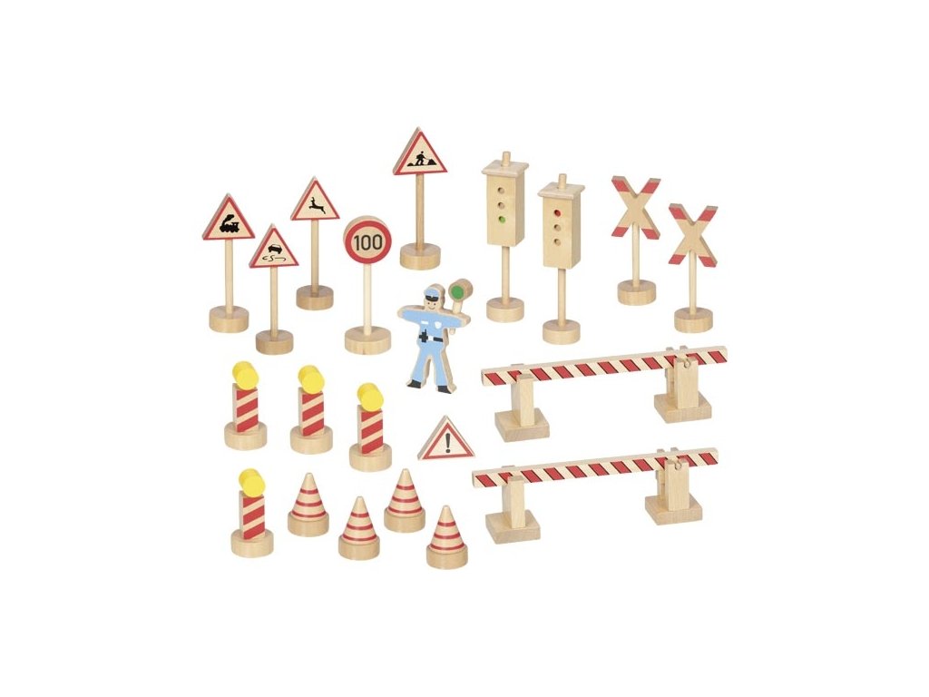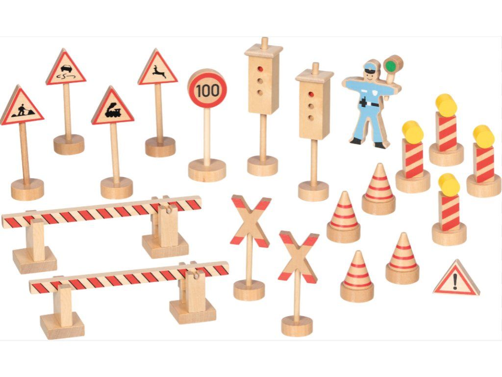 Dřevěné značky, semafory, kužely a výpravčí mohou děti umisťovat kolem vláčkodráhy nebo autíček a vytvářet tak vlastní dopravní scénáře, které podporují představivost i sociální hru. Hra rozvíjí rozpoznávání symbolů, logické uvažování, koordinaci a učí děti základním konceptům bezpečného pohybu v dopravním prostředí. Součástí je i postavička policisty s plácačkou, který může řídit dopravu.