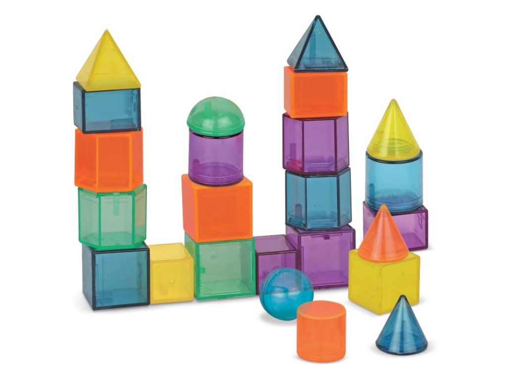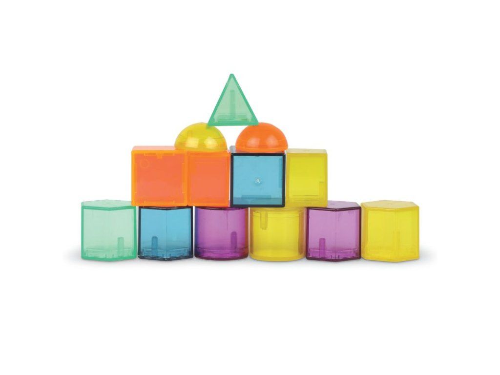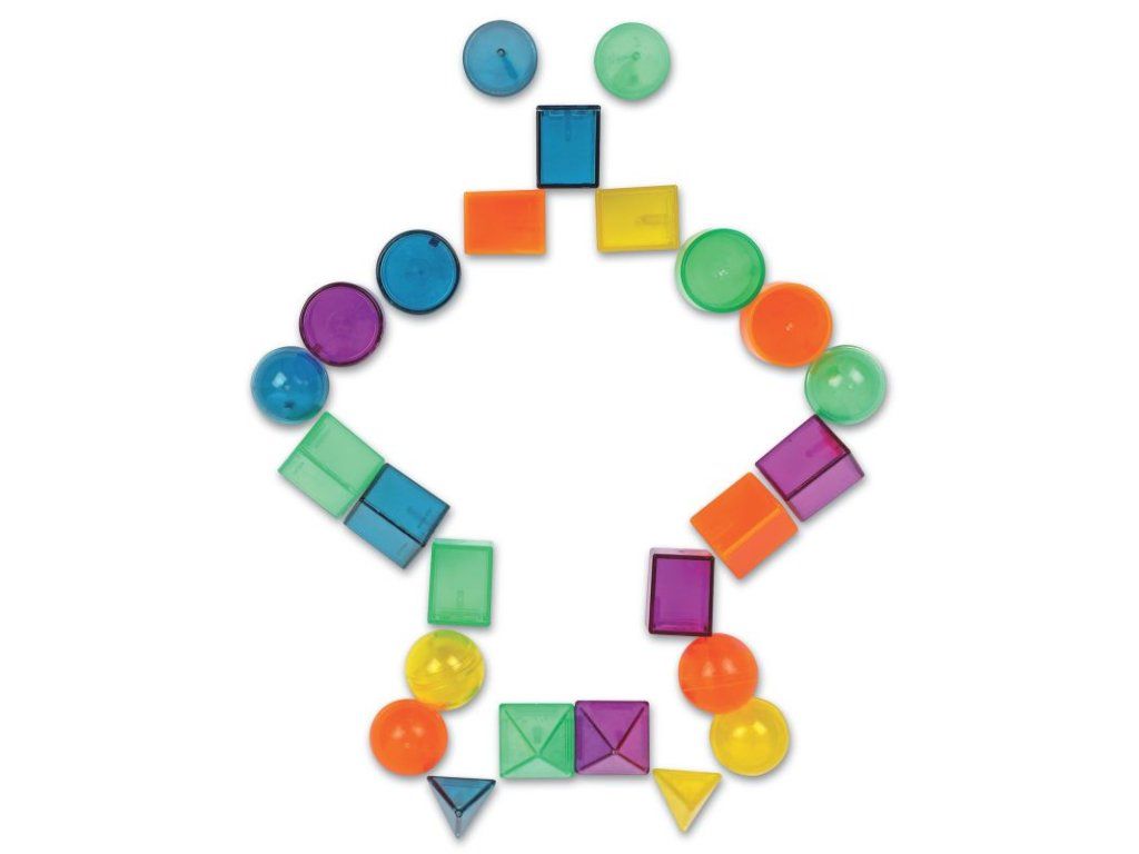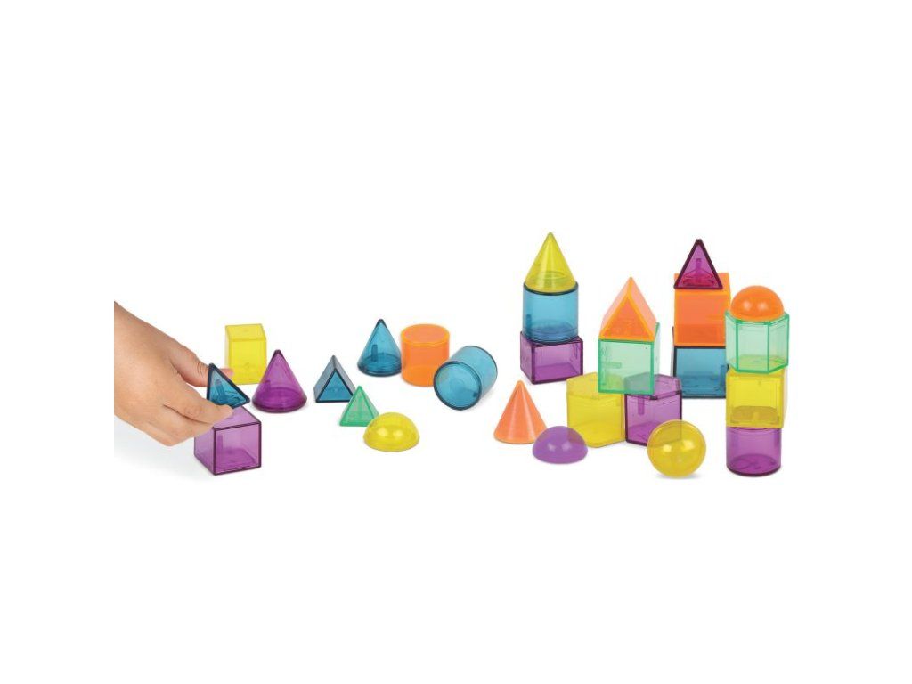 Velká sada průhledných geometrických 3D tvarů v atraktivních barvách. Děti díky nim potrénují znalost tvarů, jemnou motoriku, koordinaci ruka oko i svou kreativitu. Tvary se dají využít i na světelném panelu či stolu.