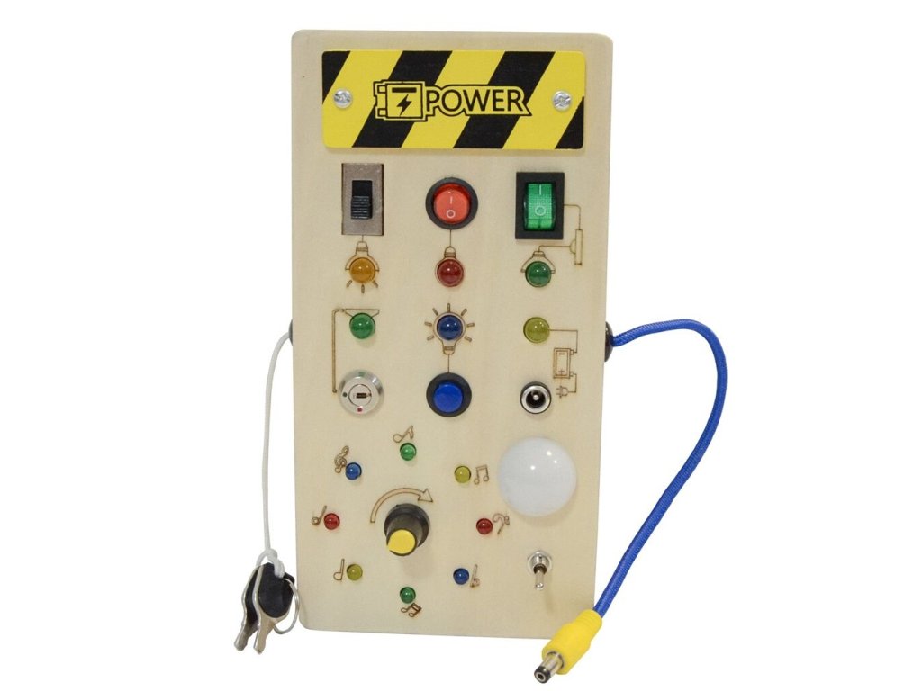 Co se stane, když zasunete zástrčku do zásuvky? Nebo když otočíte klíčkem v zámku či v zapalování? A co musíte udělat, aby se rozsvítilo světlo? Na všechny otázky odpoví tato dřevěná deska s aktivitami, která nabízí spoustu možností ke zkoumání příčiny a následku. Deska je vybavena řadou interaktivních prvků, jako jsou spínače, LED světýlka a další. Světla se rozsvěcují najednou nebo postupně v závislosti na vypínači a aktivují se např. pomocí přiloženého klíče, který je potřeba zasunout do zámku, a také kabelem se zástrčkou, který se zapojí do zásuvky na desce, a jsou doplněna zvuky.