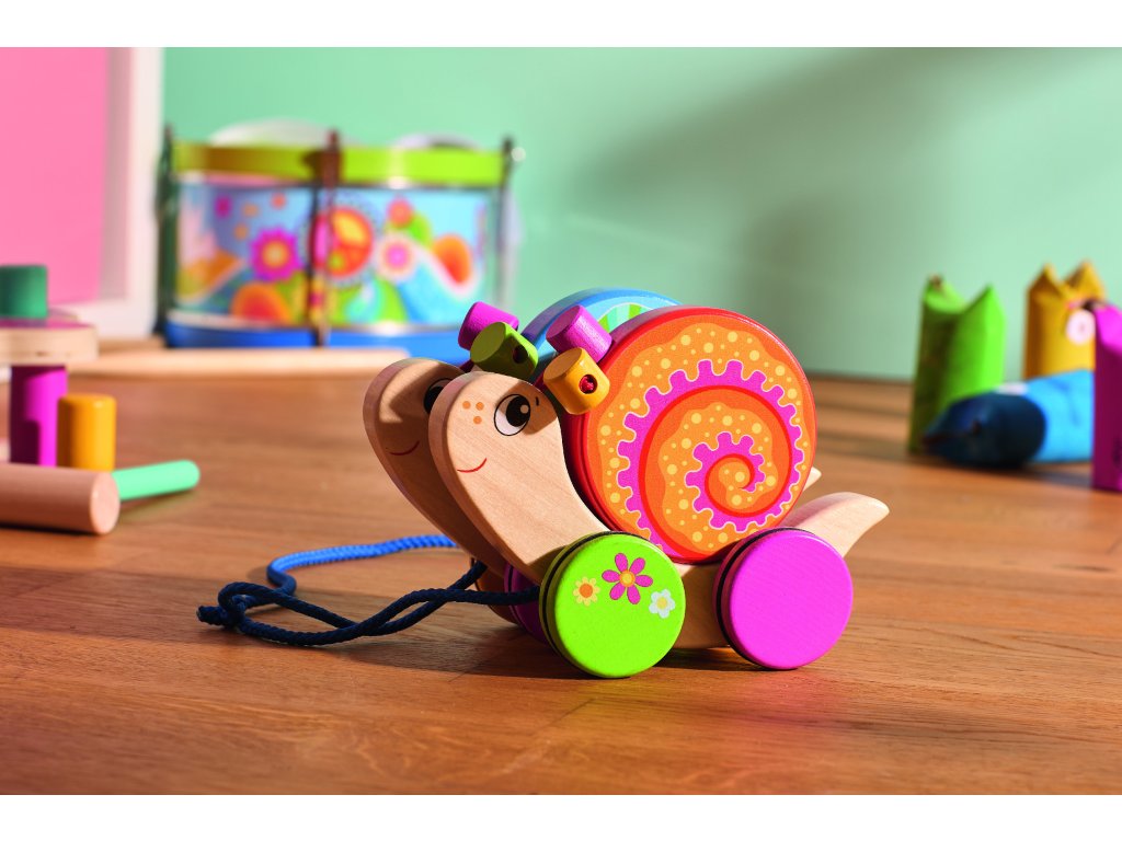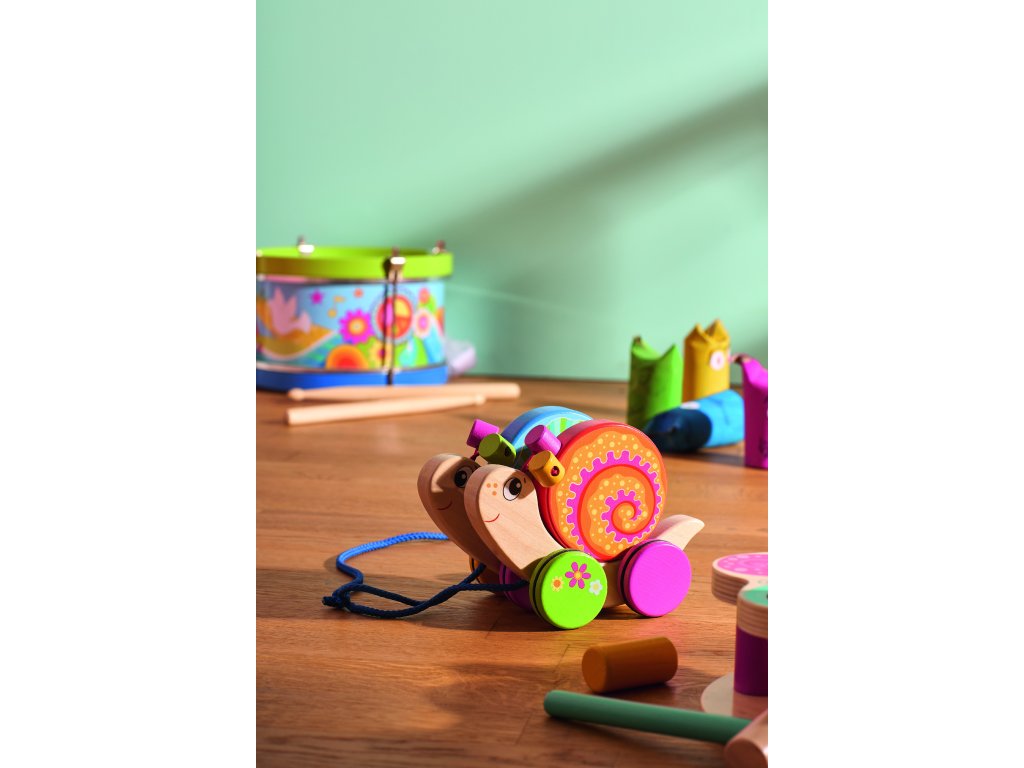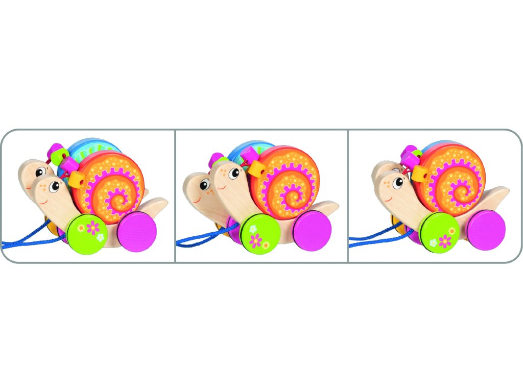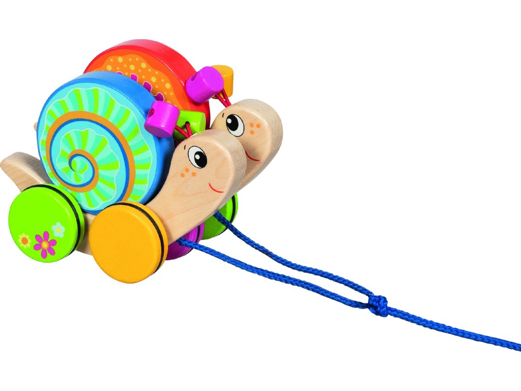 🐌 Hrubou a jemnou motoriku – dítě táhne hračku za sebou, učí se chůzi, koordinaci kroků a pohyb.