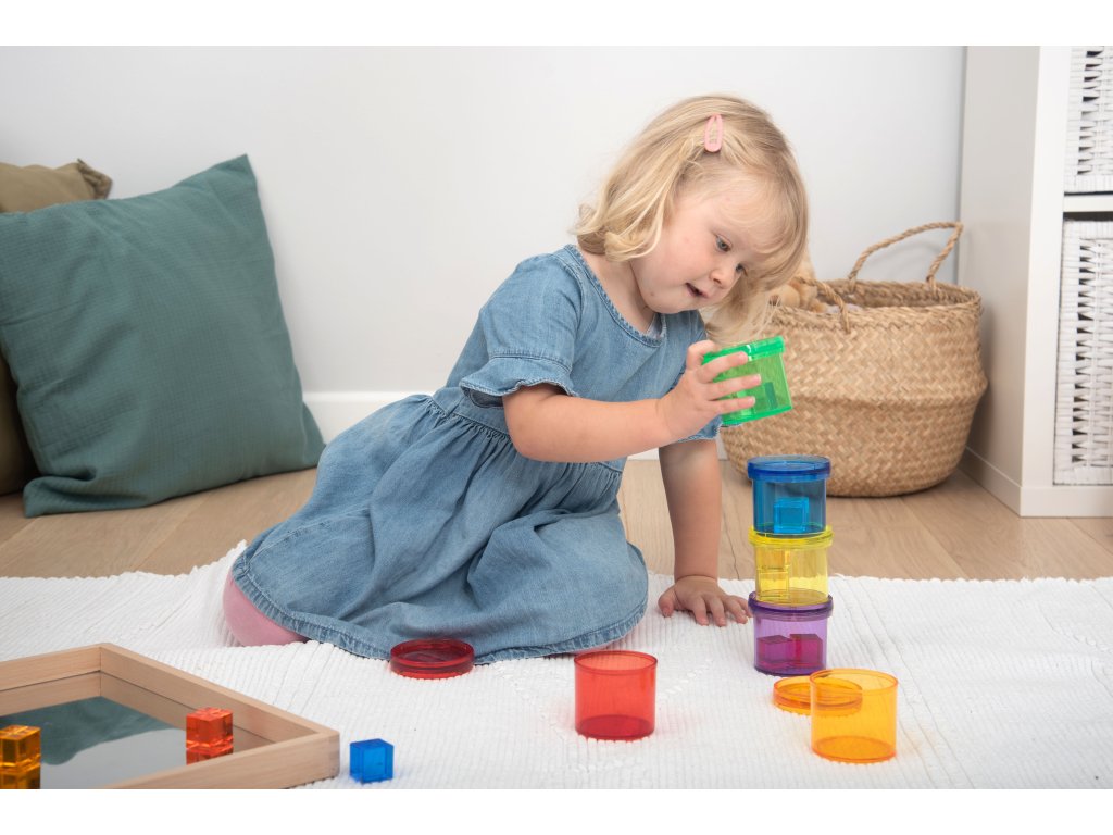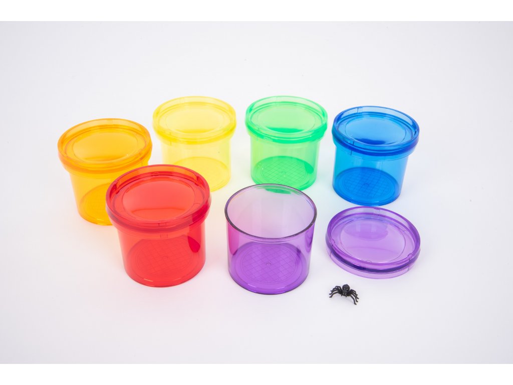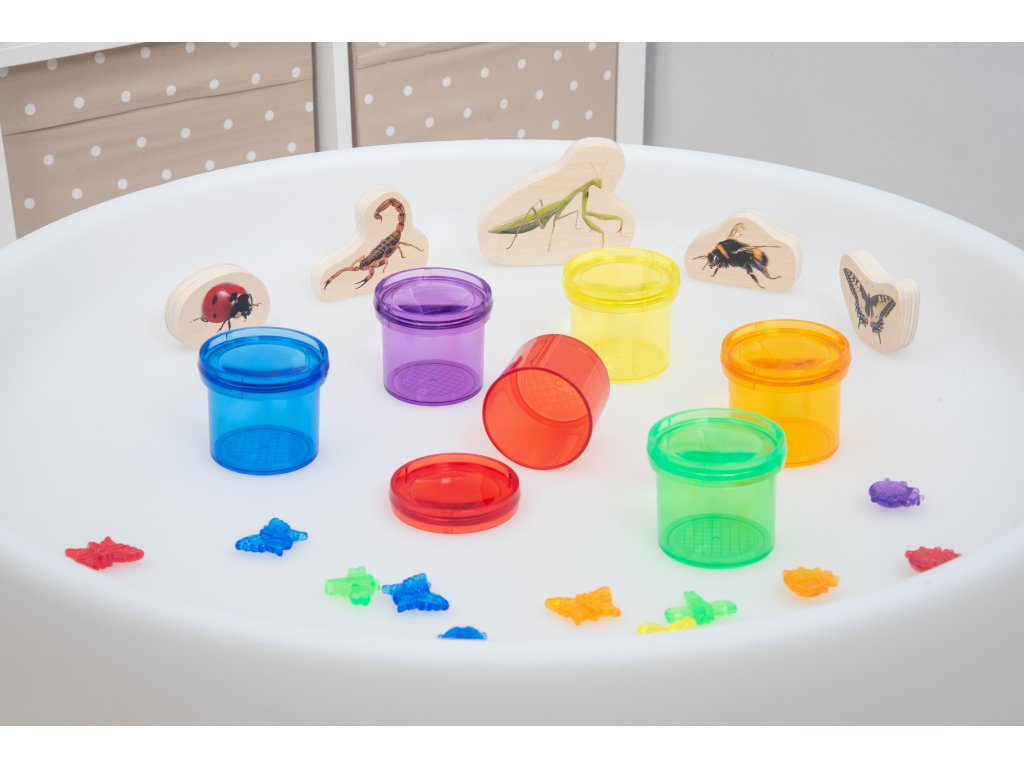 Sada pozorovacích dóz, které mají zvětšovací snadno nasazovací víčko s lupou a měřící mřížku na dně. Robustní akrylové nádoby umožňují ostré sledování barev ze všech úhlů. Ideální pro senzorickou hru. Lupa nabízí 3x zvětšení. Děti si v těchto dózách mohou prohlížet brouky, kamínky a různé další poklady nejen z přírody. Díky průsvitným barvám jsou ideální pro použití na světelném LED panelu.