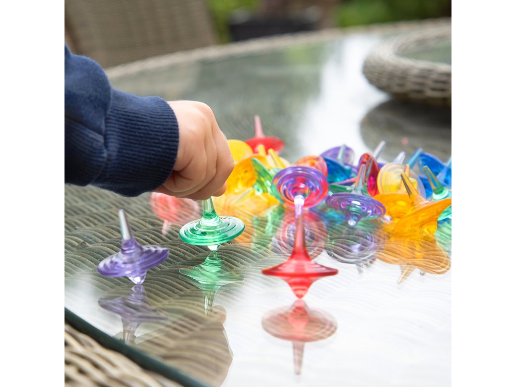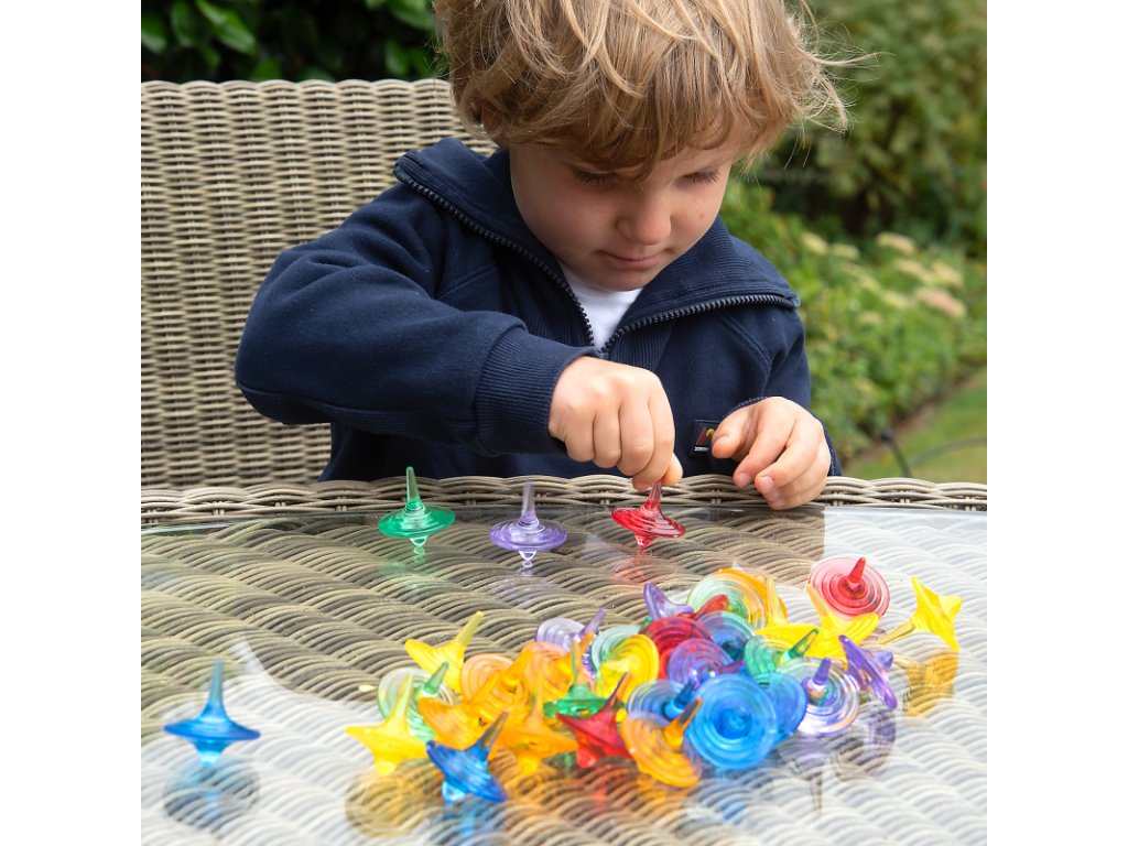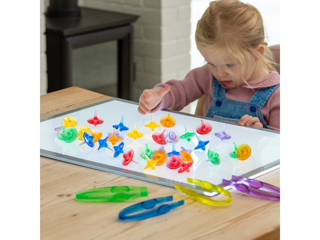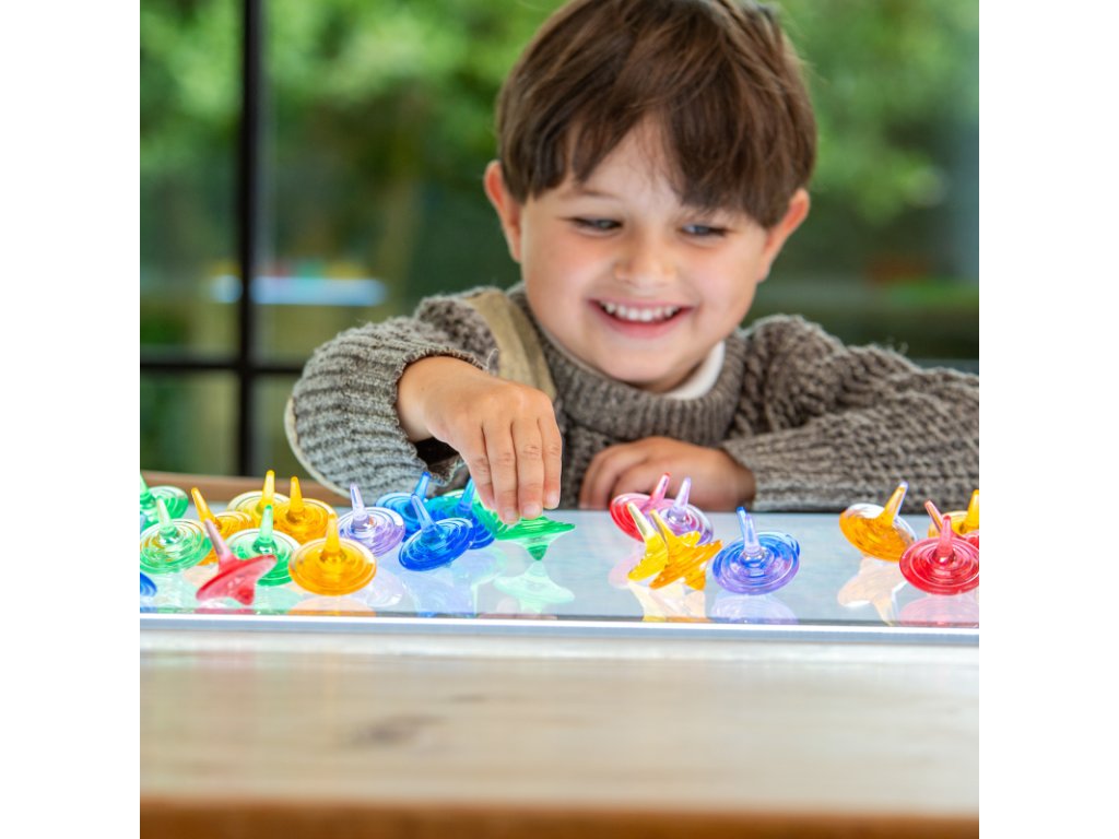Třídící senzorický set Průsvitné barevné káči – 72 ks je jedinečná senzorická pomůcka, která děti okamžitě zaujme svou jednoduchostí i vizuální přitažlivostí. Káči se snadno roztočí, krásně se točí na hladkém povrchu a vytvářejí poutavé barevné víření. Díky průhlednému materiálu se perfektně hodí i ke hře na světelném panelu.