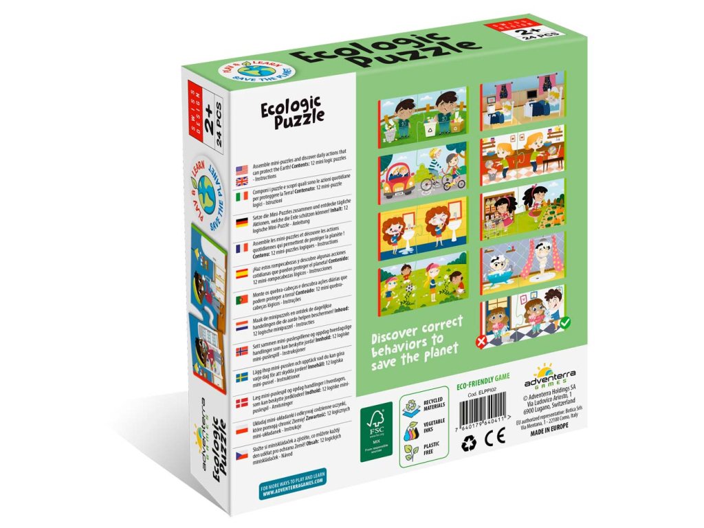 Obsahuje 12 logických mini skládaček a návod. Rozměr jednoho složeného puzzle 188 x 82 mm. Ekologické provedení – vyrobeno z recyklovaných materiálů a netoxických barev.