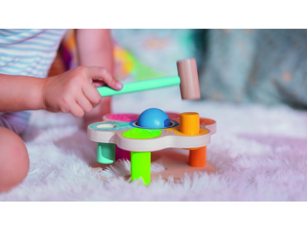 Dítě pomocí dřevěného kladívka zatlouká barevné kolíky a kouli do otvorů a sleduje, jak mizí – jednoduchý princip, který dokonale trénuje přesnost, trpělivost a sílu úchopu.