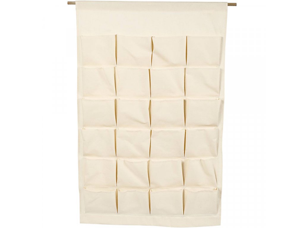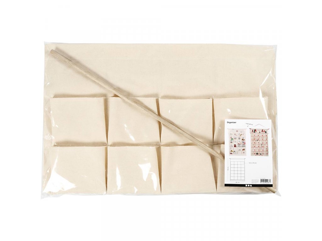 Praktický organizér ze silného plátna s kapsami, vyztuženou zadní stranou a tyčí pro lepší stabilitu. Ozdobte si tento organizér, jak se vám líbí! Použijte fixy, barvy, filc, látku, tisknutelné motivy nebo cokoli, co se vám padne do oka. Vytvořte si vlastní osobitý organizér nebo originální adventní kalendář s vašimi dětmi!