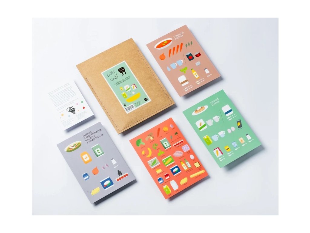 Obrázková kuchařka Děti vaří přináší sadu jednoduchých receptů, které zvládnou samy děti - využívá snadný obrázkový návod a minimum textu – a tam, kde je nutný, používání velkých tiskacích písmen pro snadnější čtení. Sada obsahuje celkem 14 receptů na přípravu jídel od snídaně až po večeři. Skvělý dárek pro malé kuchaře a kuchařky již od 4 let.