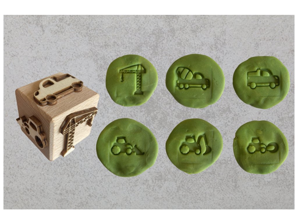 Dřevěná kostka o velikosti 4x4cm je ozdobena ze všech stran stavebními stroji, které dítě jednoduše obtiskne třeba do modelíny. Je možné je nabarvit třeba i temperou, a obtisknout na papír.