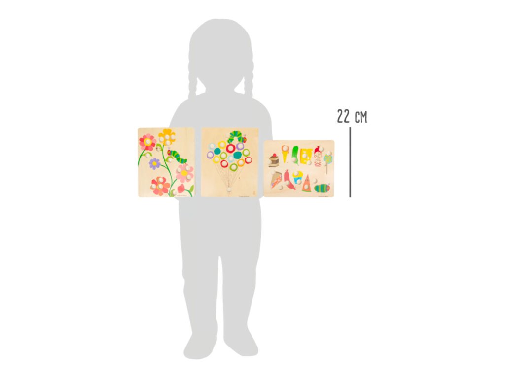 - 3 dřevěné oboustranné desky (celkem tedy 6 motivů)