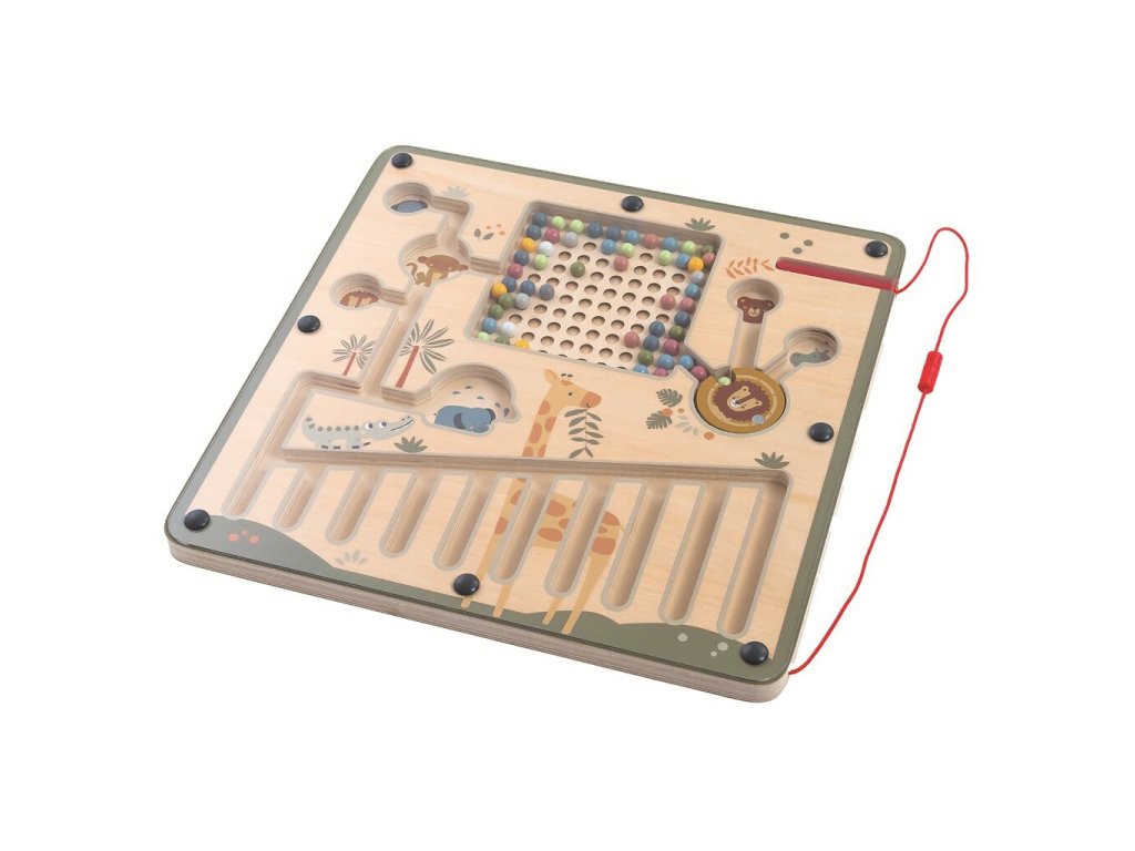 Magnetická hrací deska s motivem roztomilých zvířátek je skvělým pomocníkem pro rozvoj jemné motoriky, logického myšlení a prostorové orientace dětí. Uvnitř čtvercového labyrintu se nachází zásobník s barevnými kuličkami, které se pomocí šňůrkou připojeného magnetického pera přesouvají po vyfrézovaných cestičkách ke zvířátkům nebo do zásobníků. Pero je vždy po ruce a snadno se s ním manipuluje. Děti mohou skládat jednoduché obrázky podle pěti přiložených předloh, vést kuličky ke správným zvířátkům, nebo je třídit do zásobníků podle množství, od nejmenšího po největší.