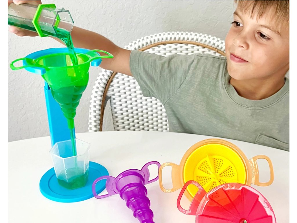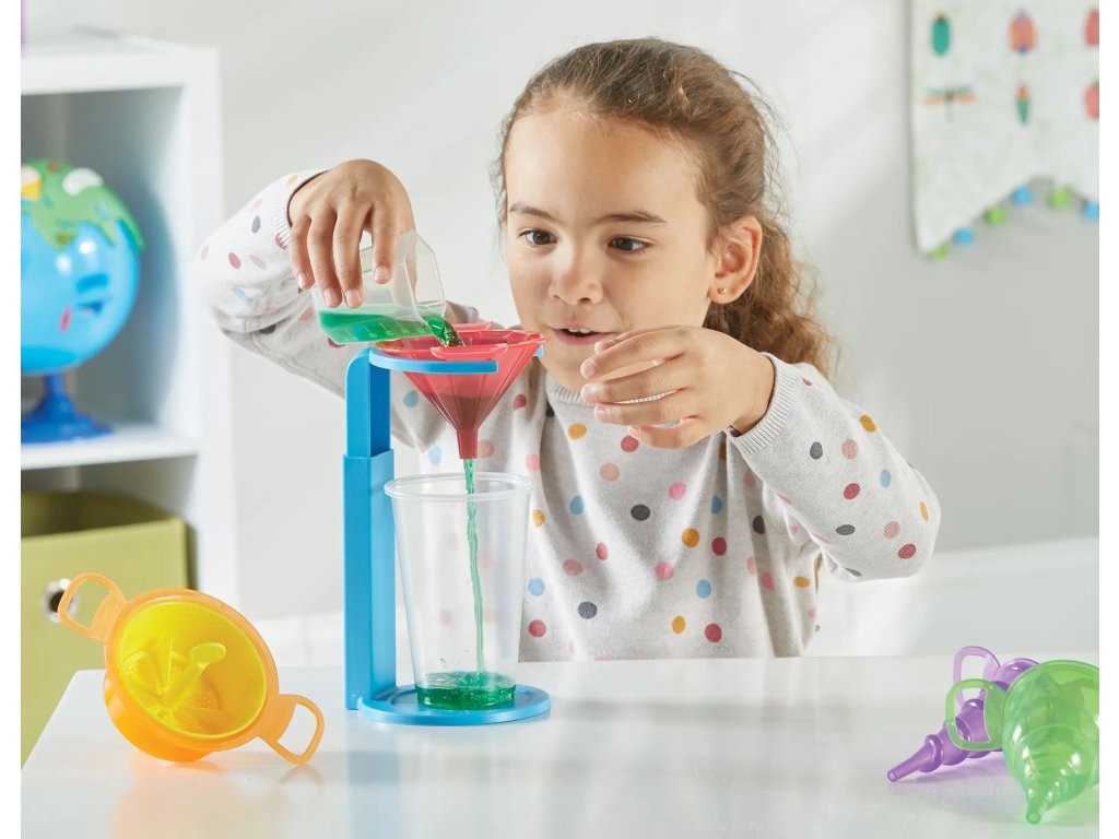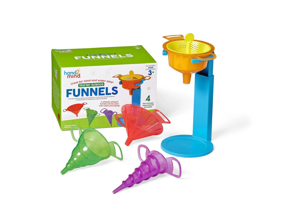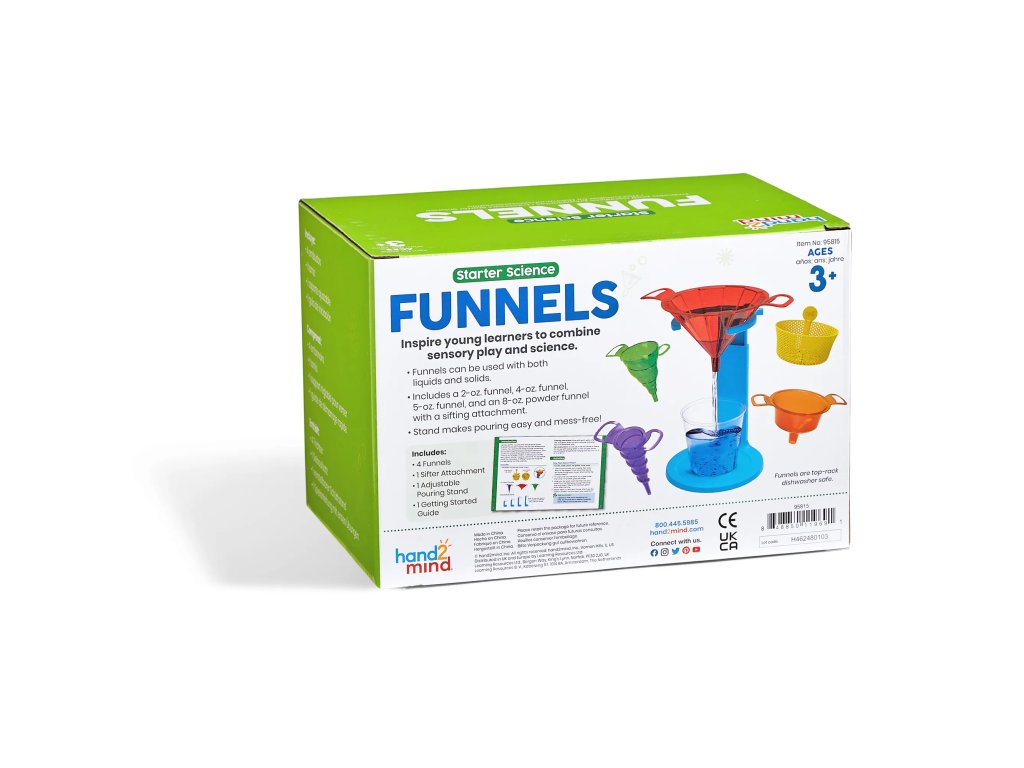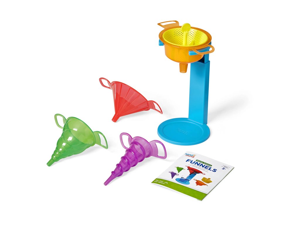 Děti objeví nekonečné způsoby, jak nalévat, míchat a prosévat s těmito odolnými nálevkami, které podněcují nápaditou hru a experimentování. Každý trychtýř má jedinečný tvar a velikost, aby vytvořil optické iluze a zapojil děti do smyslové hry, když se učí o objemu, kapacitě a dalších věcech. Tyto nálevky jsou kompatibilní s pevnými látkami i kapalinami a umožňují dětem zkoumat průtoky, objem, prosévání a další.