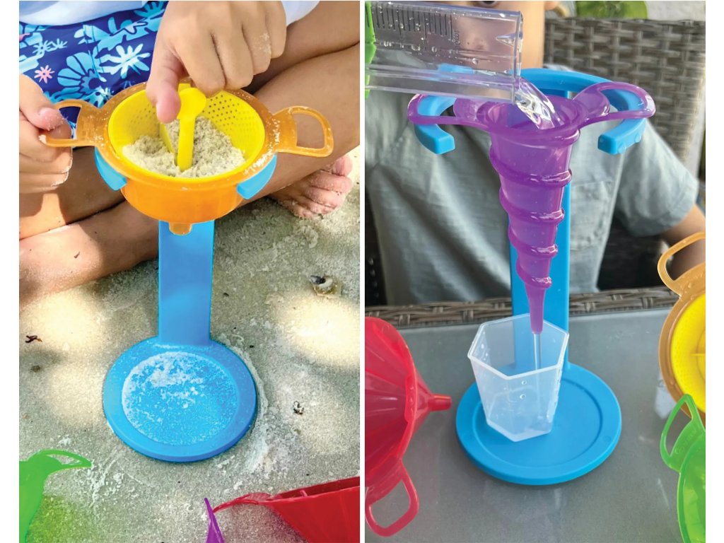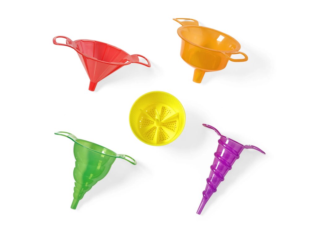 Podporujte u dětí experimentování s vodou, pískem i dalšími materiály. Každý z 5 trychtýřů má jiný tvar a velikost pro nekonečné možnosti experimentování a smyslovou hru.
