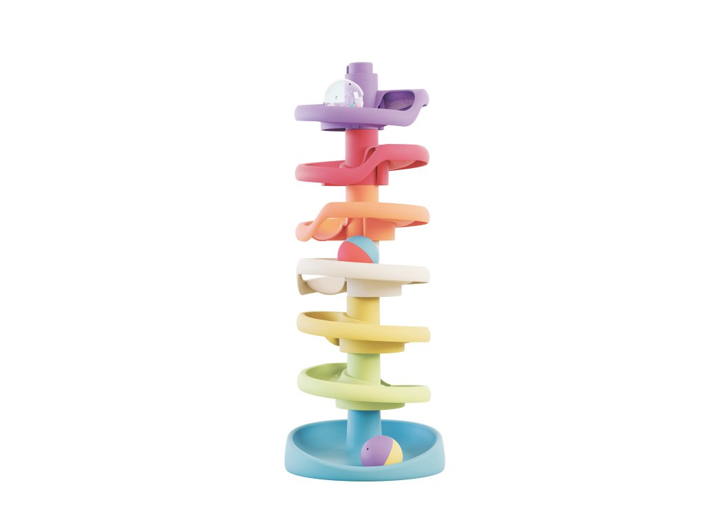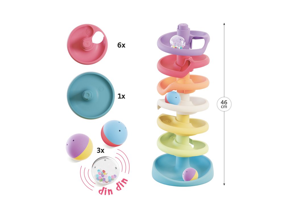 Věž složená z šesti barevných prvků s velkou základnou, aby to vše bylo pevně vyvážené. Barevné kuličky běží po spirálové dráze a poskytují zábavu všem dětem. Jedna z kuliček při pohybu chrastí. Vyrobeno v pastelových barvách a příjemné na dotek. Vhodné pro děti od 1 roku. Vyrobeno ze 100% recyklovaných materiálů v sérii PLAY ECO+.