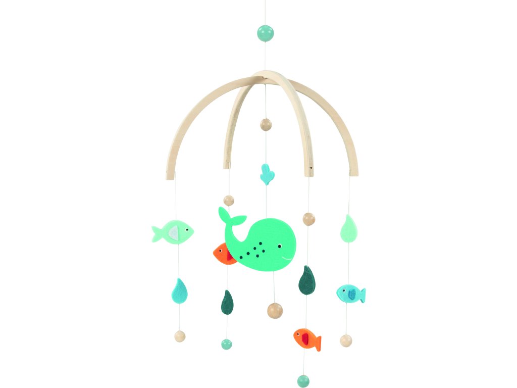 Barevný dřevěno-filtrový mobil „Whale“ – mořský svět nad postýlkou, který děti naladí na klidný spánek. Jednoduché zavěšení, jemný pohyb, krásný design.